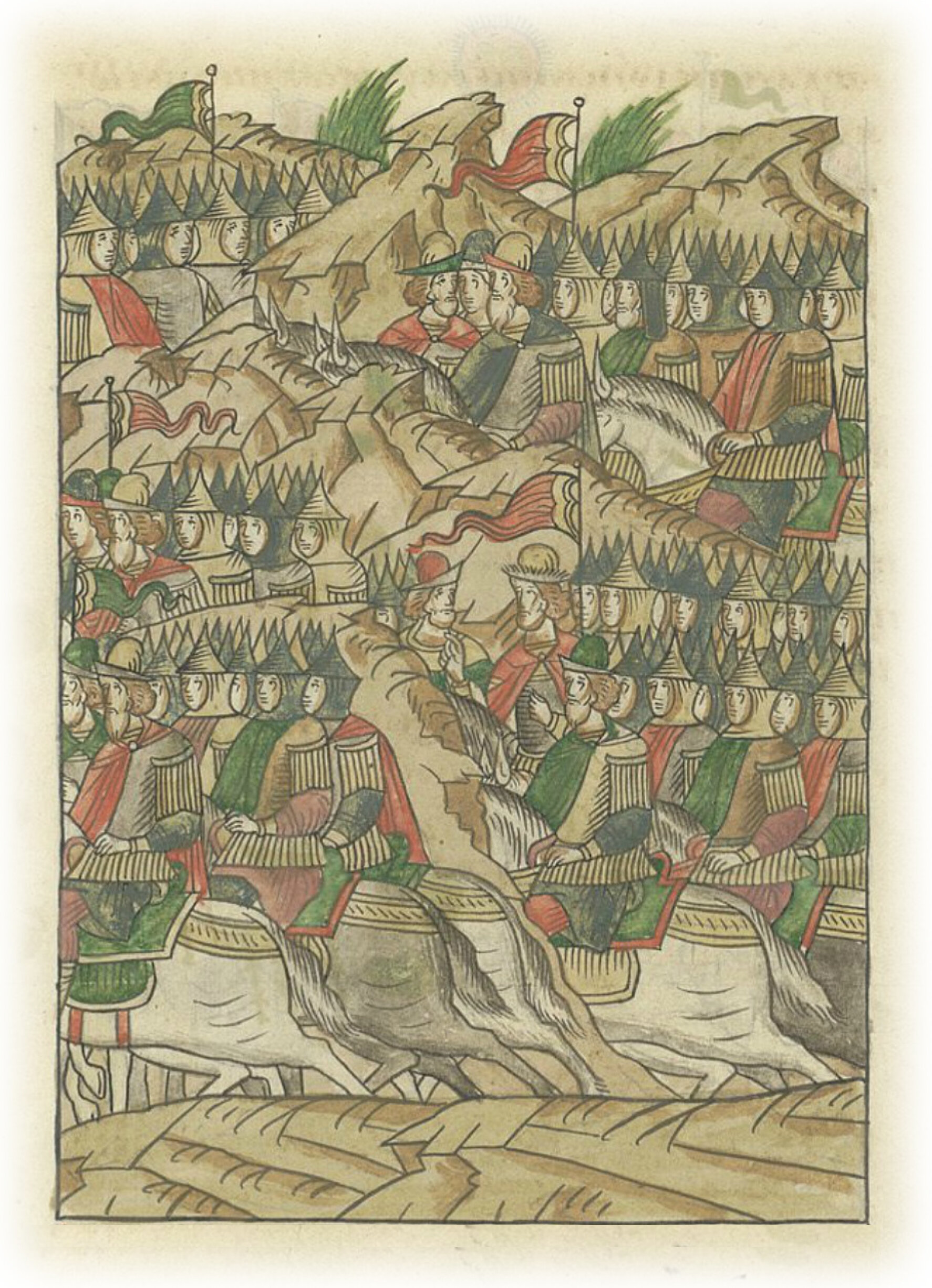 И повелел полкам своим понемногу выступать. Были же в полку его передовом воеводы его Дмитрий Всеволожский да Владимир, брат его; с правой же руки пришел Микула Василиевич, да князь Семен Иванович, да Семен Мелик со многими силами.