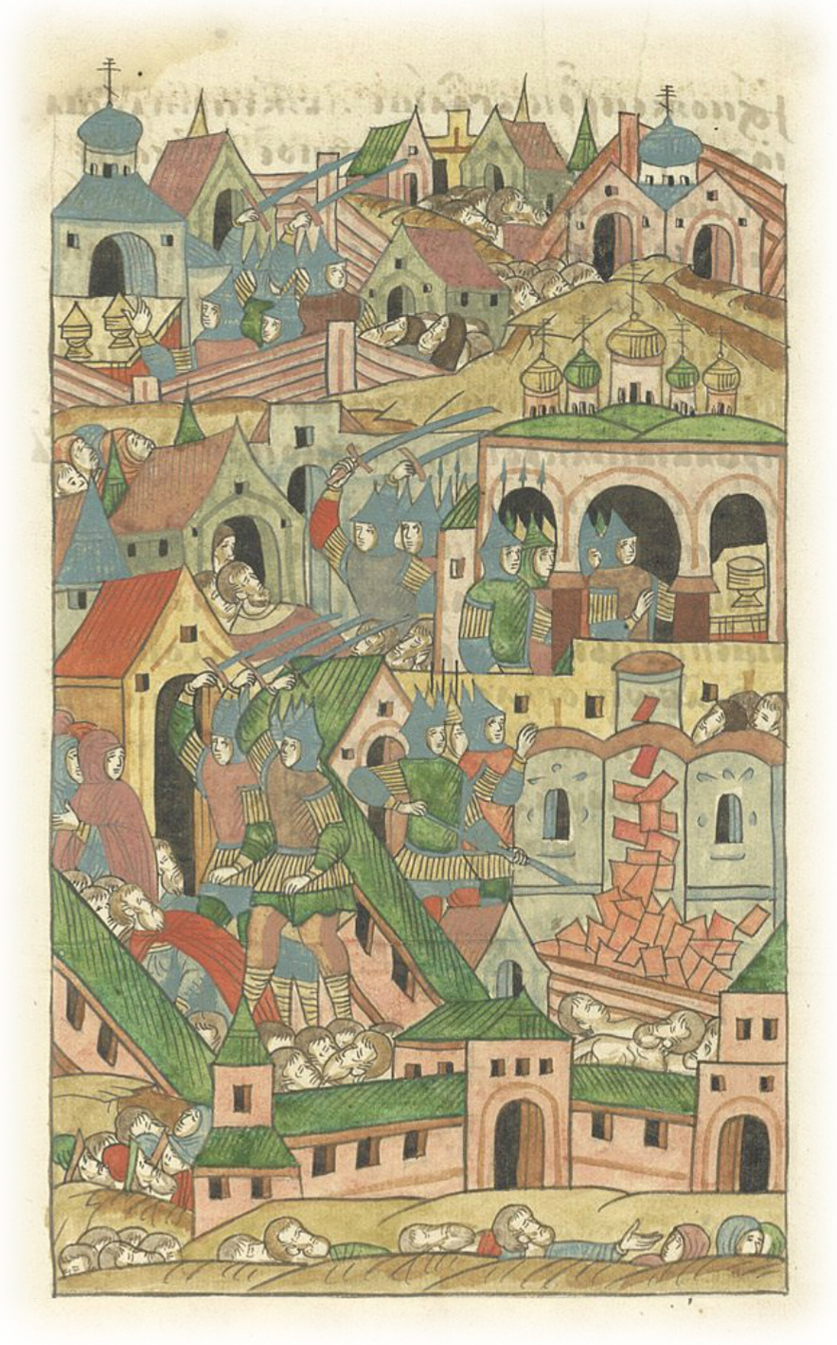 И многие монастыри разорили, и многие святые церкви разрушили, и много кровопролития окаянные содеяли, и святые места осквернили. Как пророк глаголал: «Боже, пришли язычники в достояние Твое, осквернили церковь святую Твою, сделали Иерусалим словно овощное хранилище, положили трупы рабов Твоих как пищу птицам небесным, плоть преподобных Твоих – зверям земным, пролили кровь их, как воду», – (так было) окрест Москвы, и не было погребающего их. Девиц их не пожалели, и вдовицы их не оплаканы были, а иереи и священники их от оружия пали. Ибо была тогда сеча великая очень, и бесчисленное множество пало там избиенных мужей и жен, мертвыми лежащих и непогребённых.
