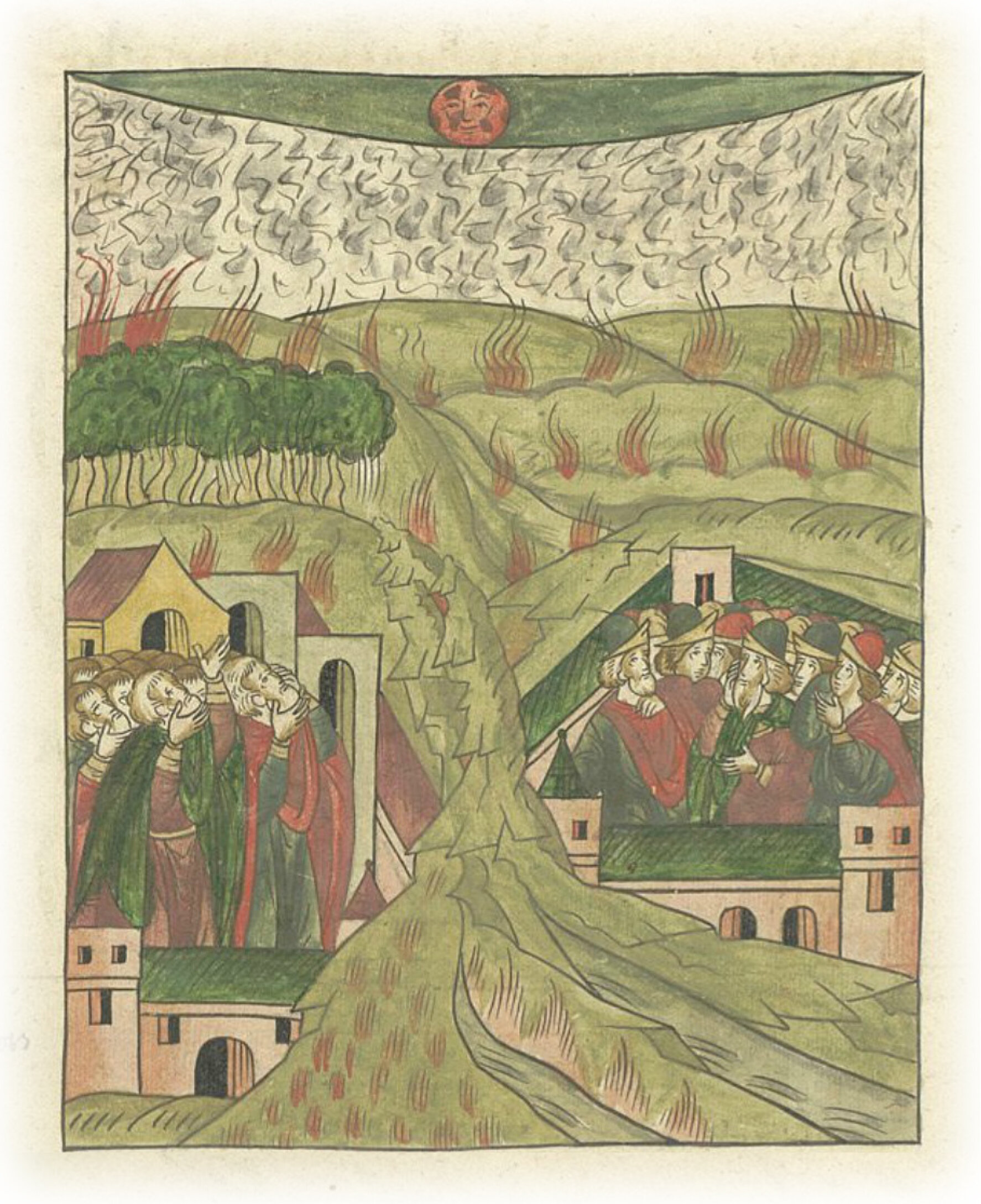 В том же году было знамение на небе, солнце стало цвета крови, и на нем появились черные пятна, мгла стояла полгода, были большой зной и жара, леса с болотами и земля горели, реки обмелели, некоторые водные источники совсем высохли. И был страх и ужас среди людей, и великая скорбь.