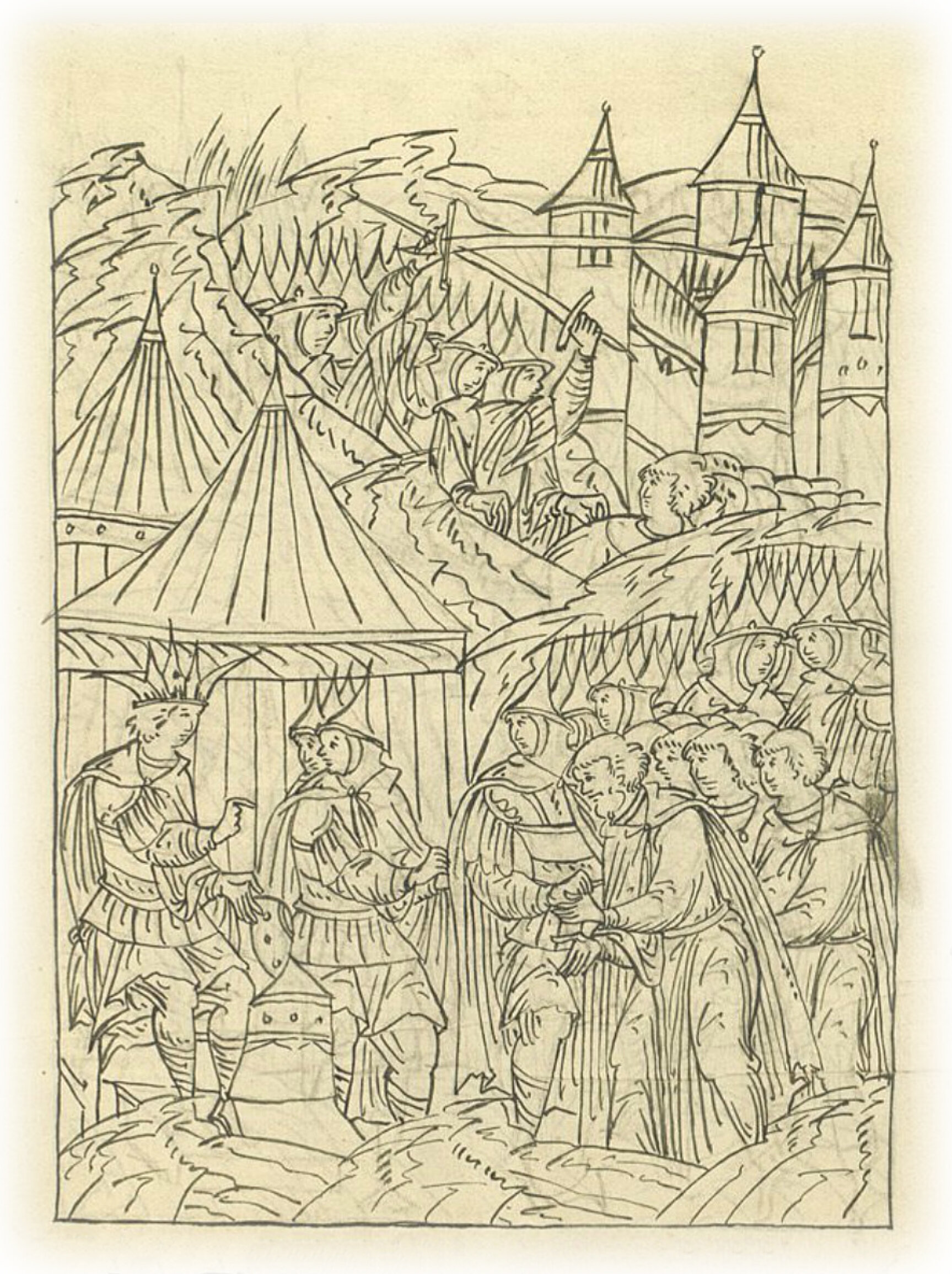 Языки говорят воеводам царя Ивана Васильевича, что магистр окопался большим рвом вокруг города Рындола, бьет из пушек и пищалей и приступает к Рындолу.