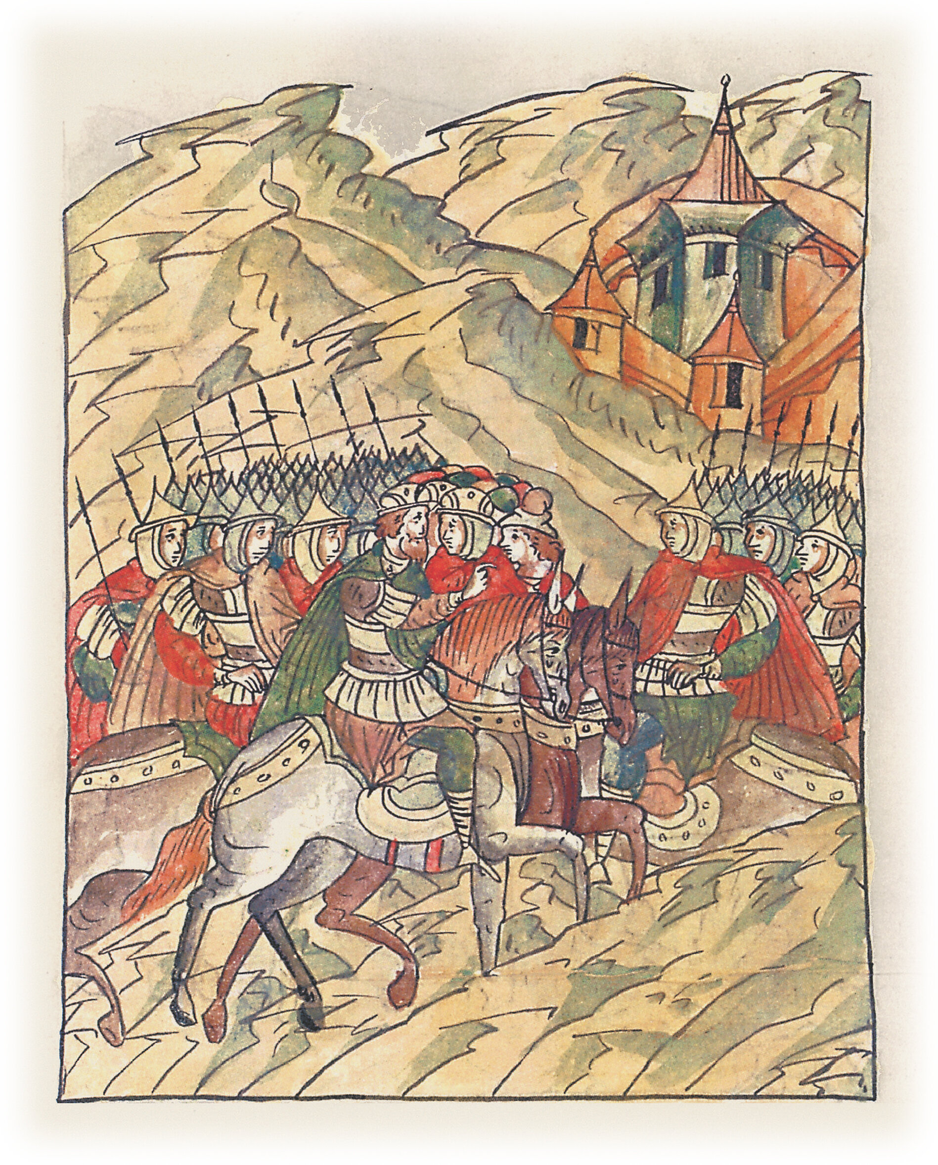 И пришел он к вятичам, и встал, не дойдя до Козельска; и пришли к нему из Поля половцы в помощь; он же, подумав с детьми своими и с боярами и устрашившись гнева Божьего, прилучившегося тогда,