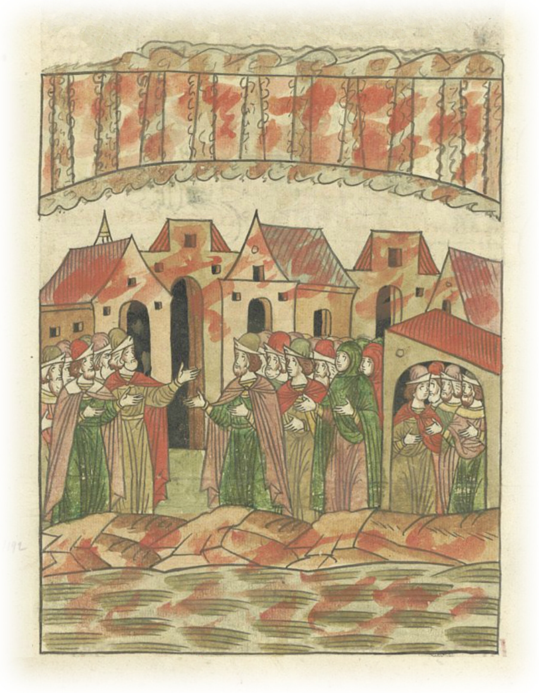 Страшное знамение. В ту же осень на небе было много знамений: ночами люди видели на небе как бы столпы, само небо было красным, будто кровавым. Не только на небе были кровавые видения, но и на земле, и на снегу видели будто бы кровь, и много было таких случаев. Еще и до того, как выпал снег, видели на земле, в воде и в домах будто бы кровь, а когда выпал снег на землю, то и на снегу лежала кровь, и все люди ходили как будто окровавленные, будто бы все в крови, но когда кто входил под крышу или в дом, то на нем не было видно ничего кровавого. Это явление предвещало грядущую великую скорбь, нашествие войск и кровопролитие, междоусобные войны, что потом и произошло.