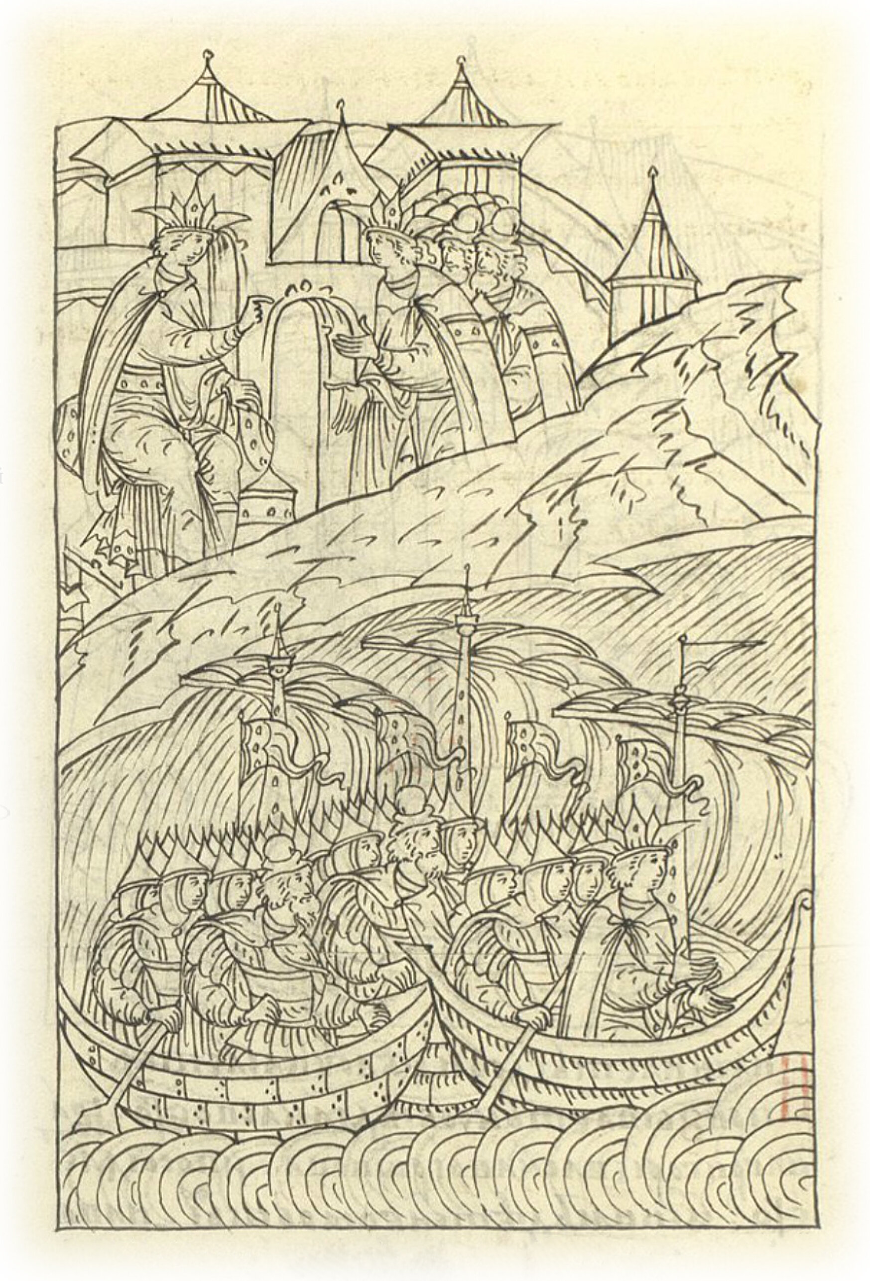 В месяце апреле отпустил царь и великий государь на судах в большом полку царя Шигалея, который прежде был Казанским царем, и с царем отпустил государь воевод: в большом полку воевода и боярин князь Юрий Михайлович Булгаков и боярин и дворецкий Даниил Романович Юрьев; в передовом полку – князь Петр Андреевич Булгаков и окольничий Иван Федорович Карпов; в (полку) правой руки воеводы – боярин и конюший Иван Петрович Федоров и князь Давыд Федорович Палецкий; в (полку) левой руки воеводы – боярин Григорий Васильевич Морозов и князь Андрей Васильевич Нагаев; а в сторожевом полку воеводы – боярин Иван Иванович Хабаров и окольничий Далмат Федорович Карпов; а с ними многие люди, дворяне царя и великого князя, боярские дети из разных городов и казанские князья, и мурзы, Костровкнязь и Чапкун, и Бурнаш с товарищами, 500 человек, так как их много тогда было у государя, город возводить.