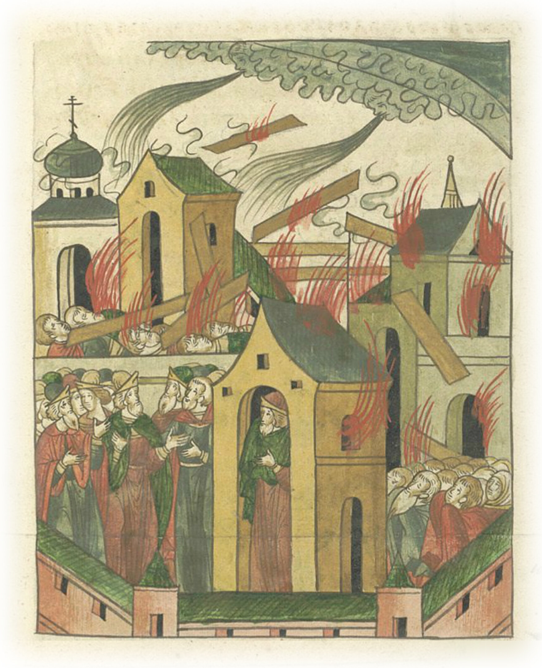 В том же году был в Москве пожар, были тогда засуха и зной великие, началась сильная буря с вихрем, распространился повсюду огонь, многие люди погибли и сгорели в огне, и все погорело. И тот пожар был назван великим пожаром, который начался от (церкви) Всех святых и распространился повсюду при помощи ветра и вихря.