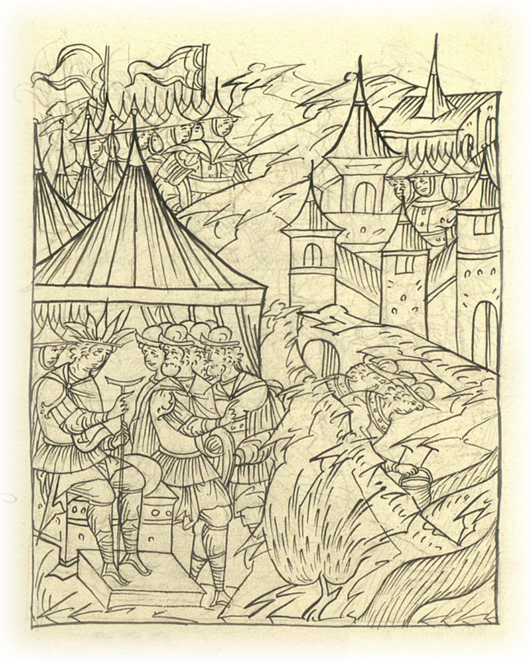 Языки говорят воеводам царя Ивана Васильевича, что магистр окопался большим рвом вокруг города Рындола, бьет из пушек и пищалей и приступает к Рындолу.