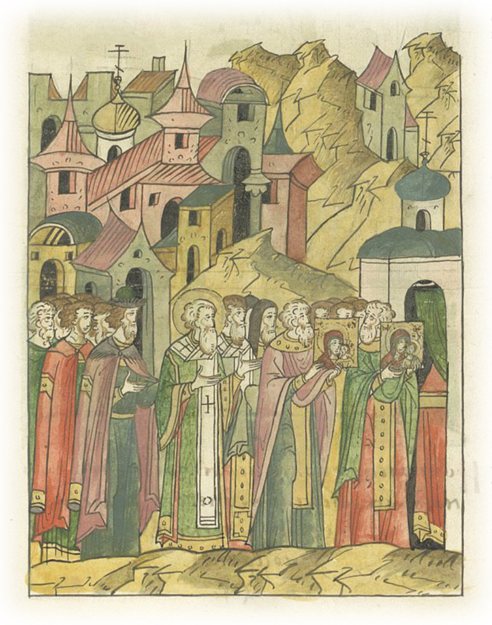 Великий князь Василий Васильевич с семьей и боярами, митрополит со всем священным собором провожают образ пресвятой Богородицы и доходят до церкви Благовещения на Дорогомилове.