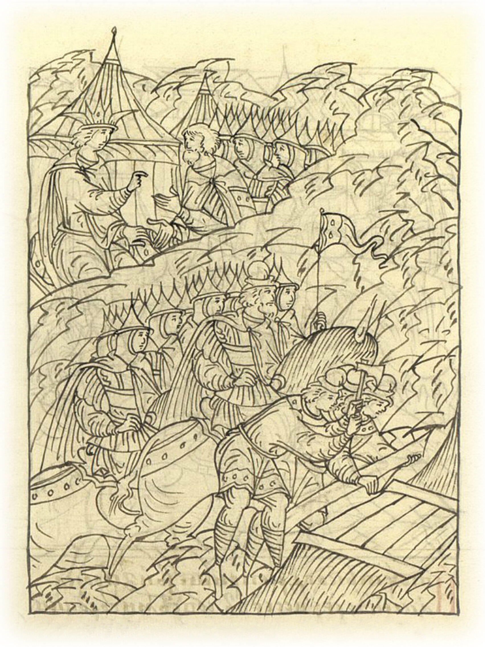 и государь ему велел идти с ертоулом вместе. И на Пьяне государь велел мосты сделать многие.