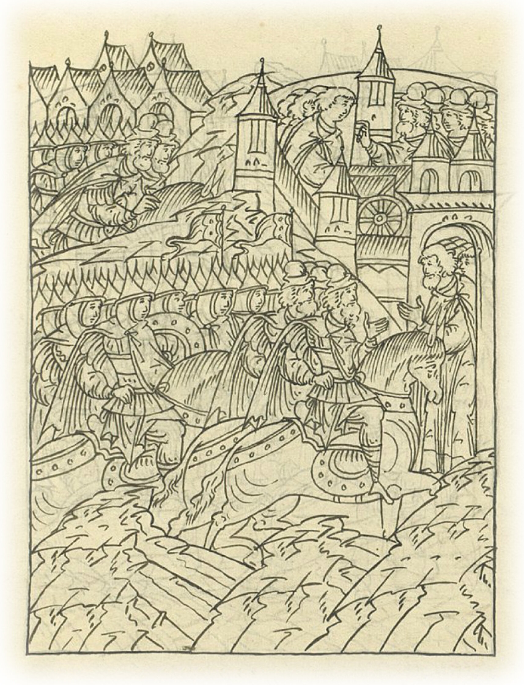 Языки говорят воеводам царя Ивана Васильевича, что магистр окопался большим рвом вокруг города Рындола, бьет из пушек и пищалей и приступает к Рындолу.