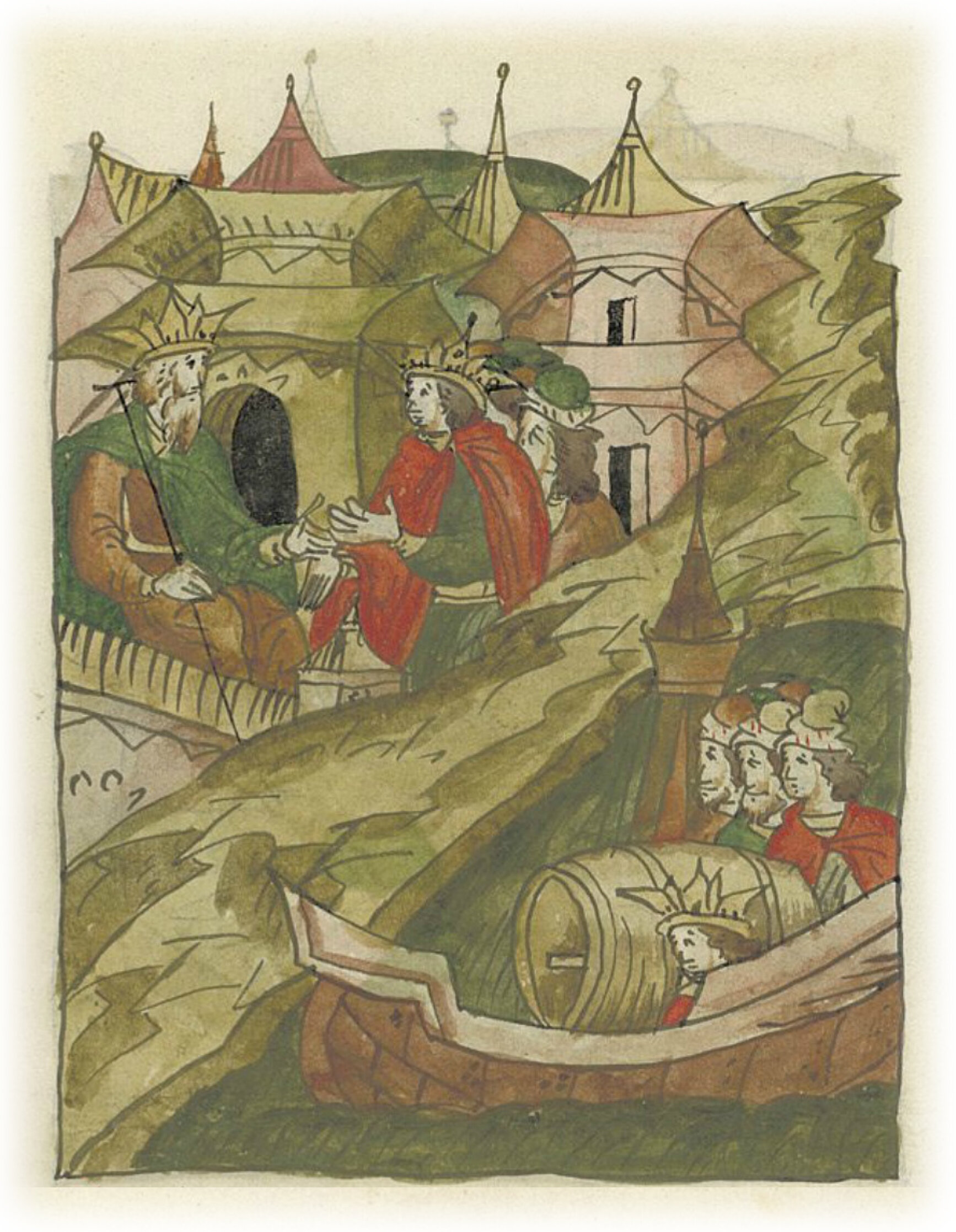 Ругодивские посадники Яким и Захар приезжают в Москву. Воеводы царя Ивана Васильевича Алексей Адашев и Иван Михайлов сообщают им, что государь пожалует их, если сдадут его воеводам помимо Ругодива Вышгород.