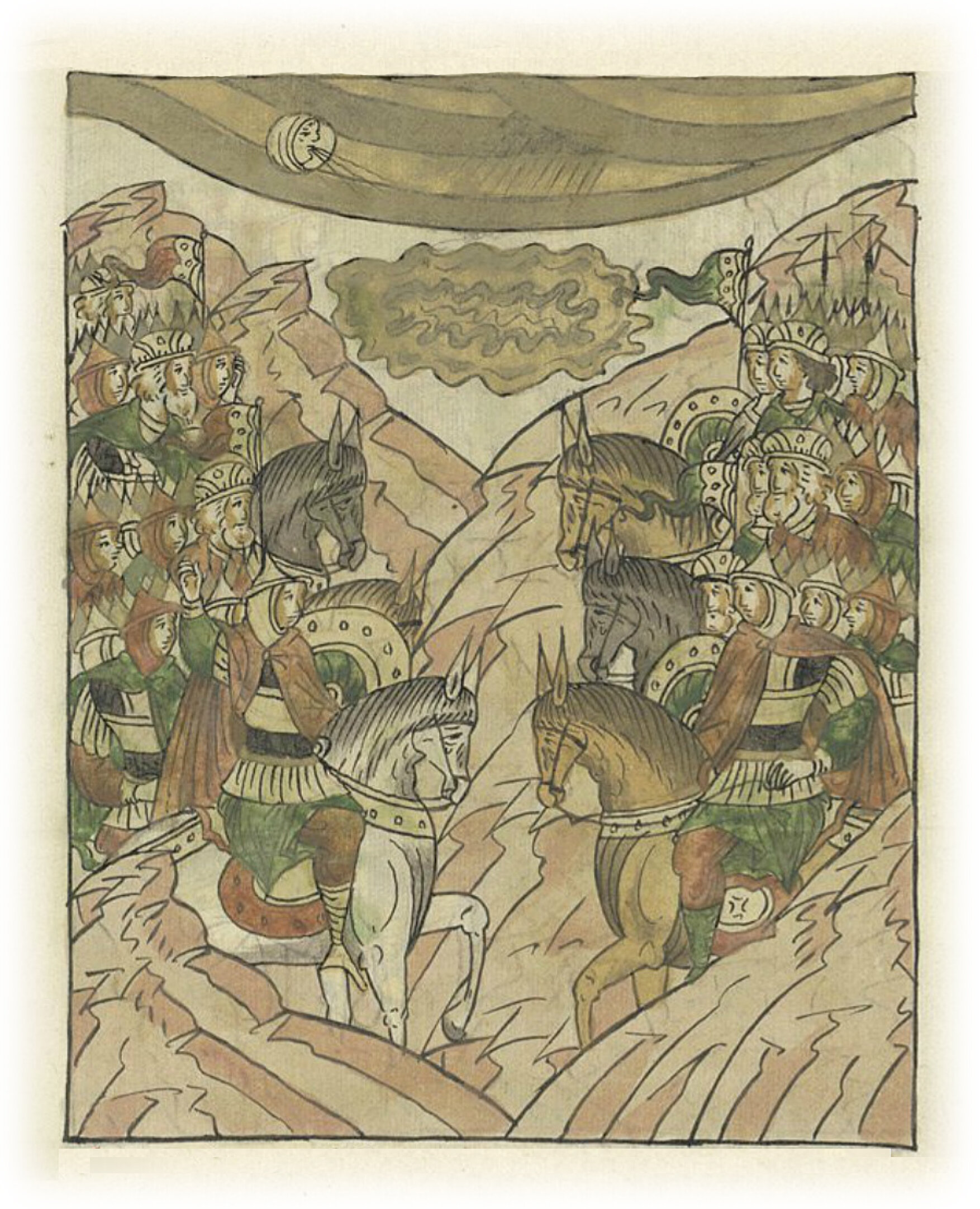 И начали сходиться полки, и собралась сила великая, и был страх и ужас у всех, потому что один род и одно племя кровь проливают ни за что, и многие, имевшие страх Божий в себе, плакали. И был тот день сначала солнечным и знойным. И тут поднялся ветер, пришла туча, бил гром непрестанно, страшные молнии (сверкали), и напал страх на всех, и стояли многие, не наступая друг на друга и мира не желая, ибо рассвирепели как звери.