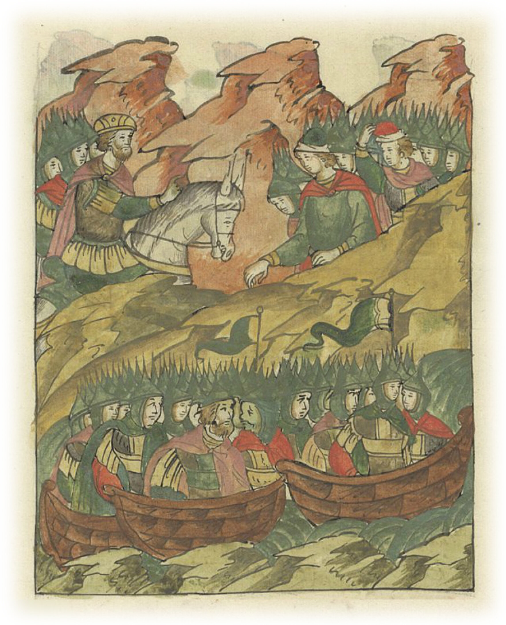 повелел всем воинам своим облачиться в броню, стяги поднять и полкам в насадах и в ладьях приготовиться.