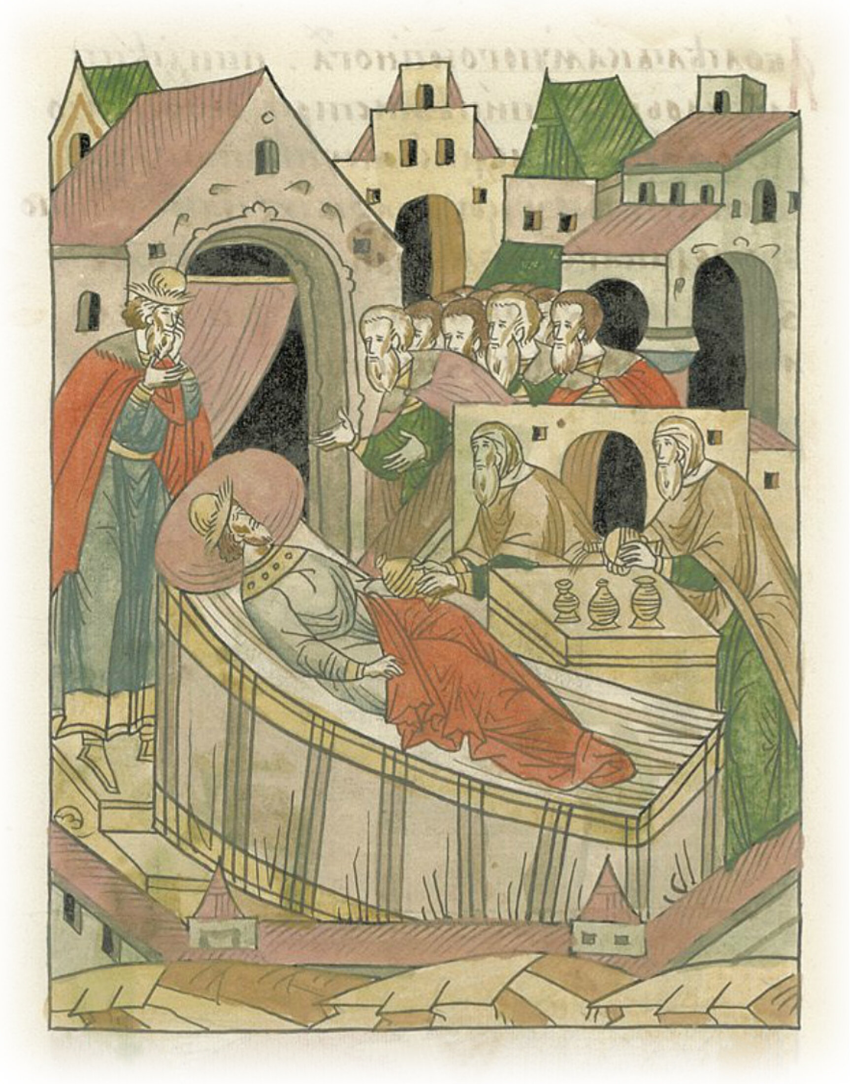 Болезнь и кончина великого князя Ивана Ивановича. Лекарь Леон дает князю зелье и начинает жечь стеклянницами по телу, вливая горячую воду, отчего князь умирает.