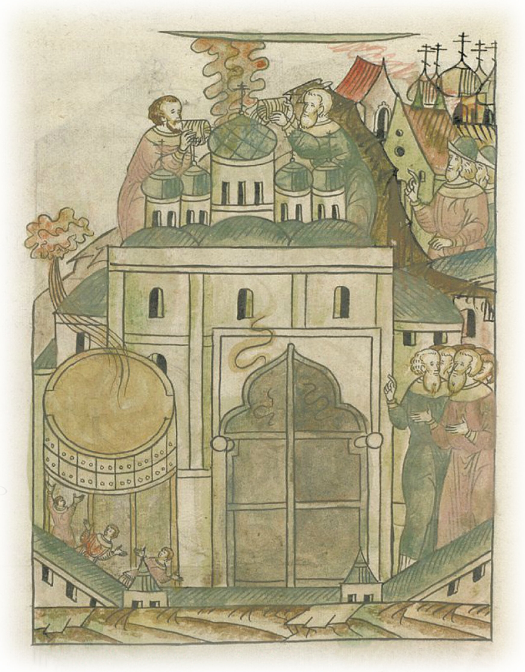 Гром с молнией зажигает верх купола у соборной церкви Успения Пречистой Богородицы в Москве. Во Владимире в церкви Благовещения Пречистой Богородицей от бури ломается крест.