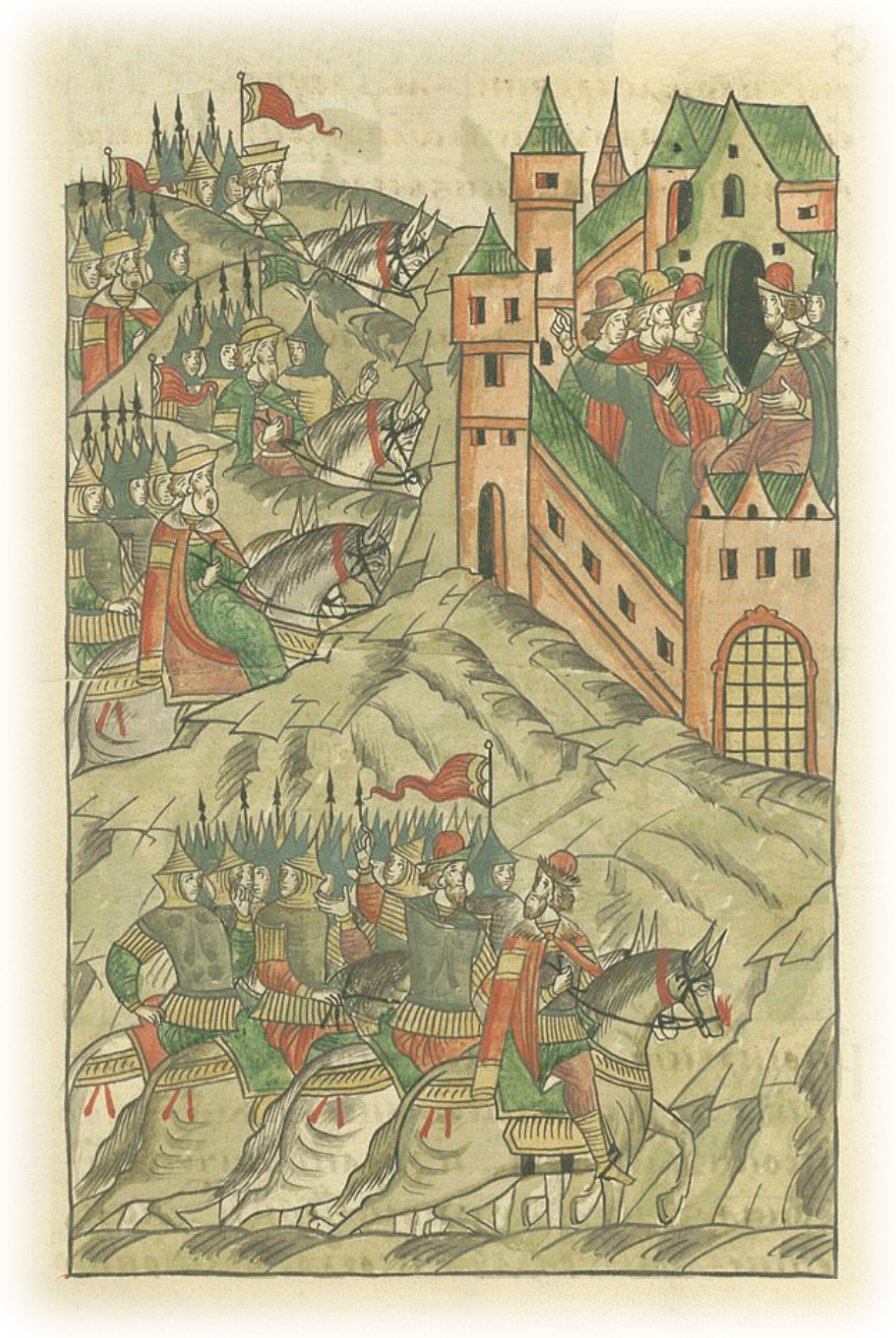Полки литовской рати во главе с князьями Скиригайло Ольгердовичем, Корибутом Ольгердовичем, Семеном Лугвеном Ольгердовичем и Витовтом Кестутьевичем приближаются к Мстиславлю на стоящих под городом смолян во главе с князем Святославом Ивановичем.