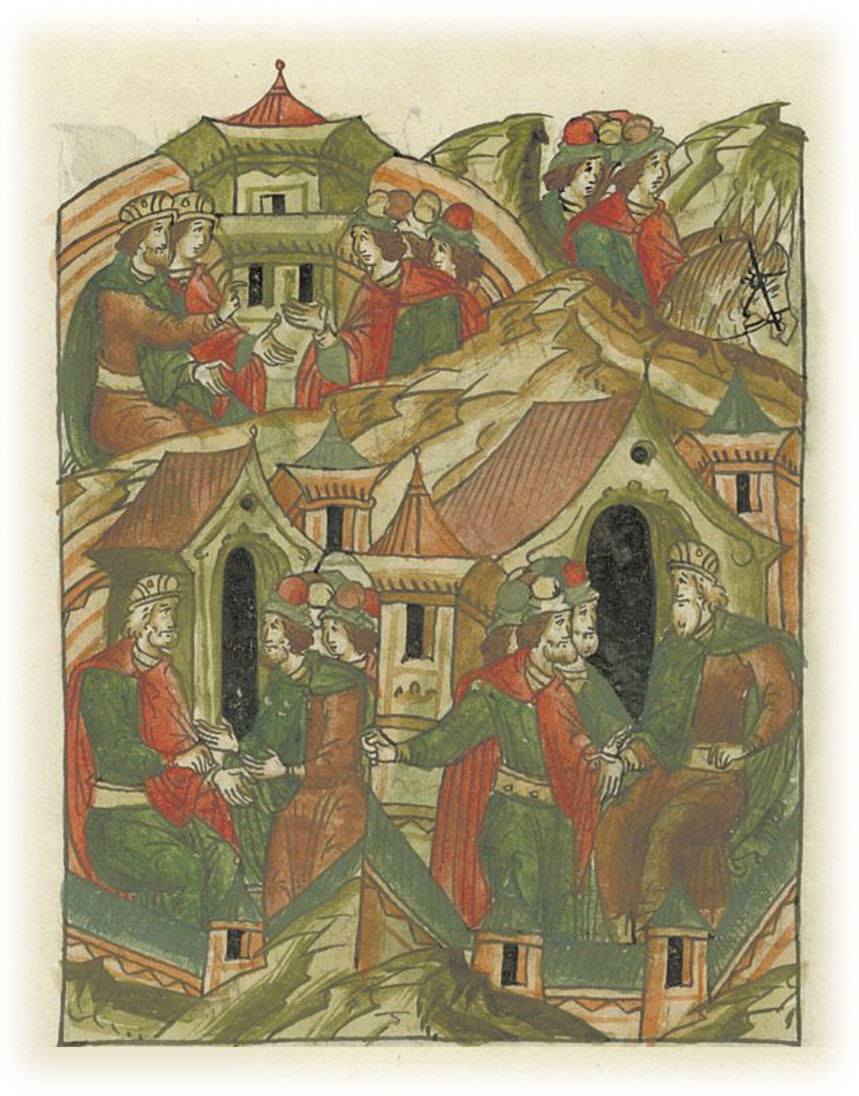 И послал других послов к Рюрику Олеговичу, говоря: «Брат! С тобой нам никакого горя не бывало, а хотя не успели этой зимой заключить договор с Всеволодом и с тобой, и твоим братом Давидом, ты же близок нам и заключи с нами договор, целуя крест, что не станешь воевать с нами, пока мы с Всеволодом и Давидом не примиримся.