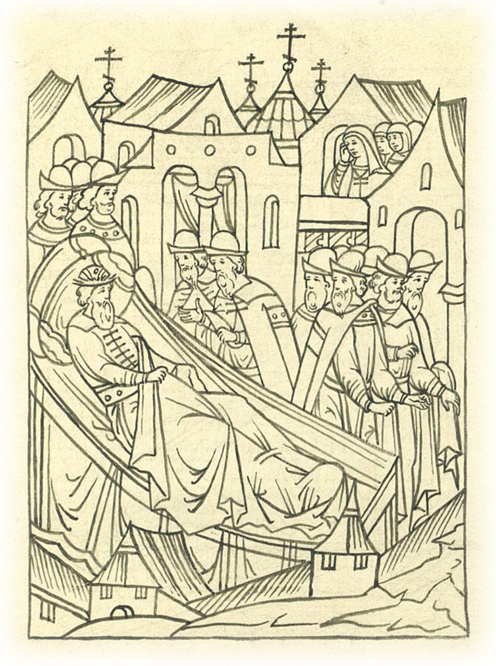 Бояре Михайло Юрьевич, князь Михайло Глинский, и Шигона остаются у великого князя Василия Ивановича до самой ночи.