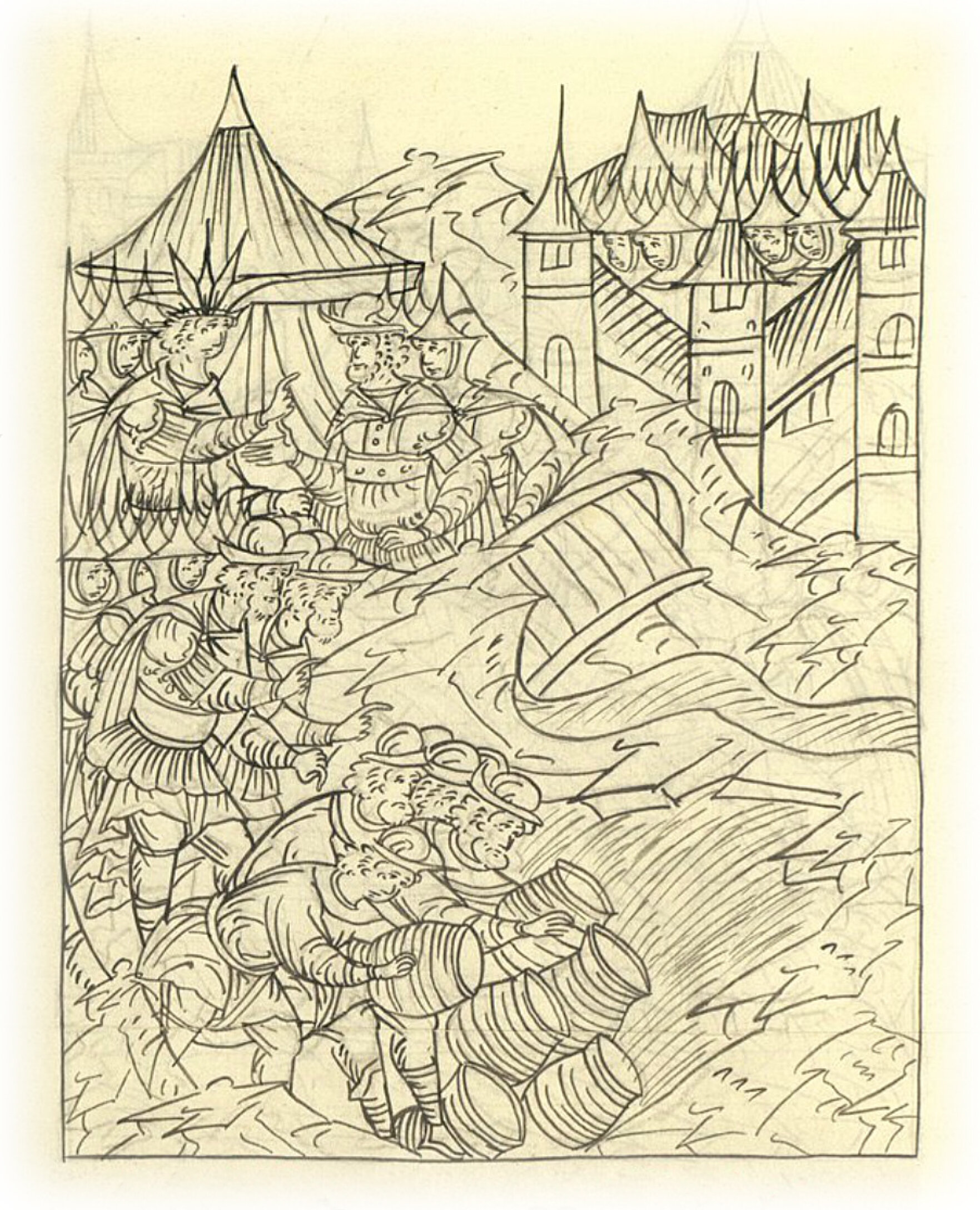 Языки говорят воеводам царя Ивана Васильевича, что магистр окопался большим рвом вокруг города Рындола, бьет из пушек и пищалей и приступает к Рындолу.