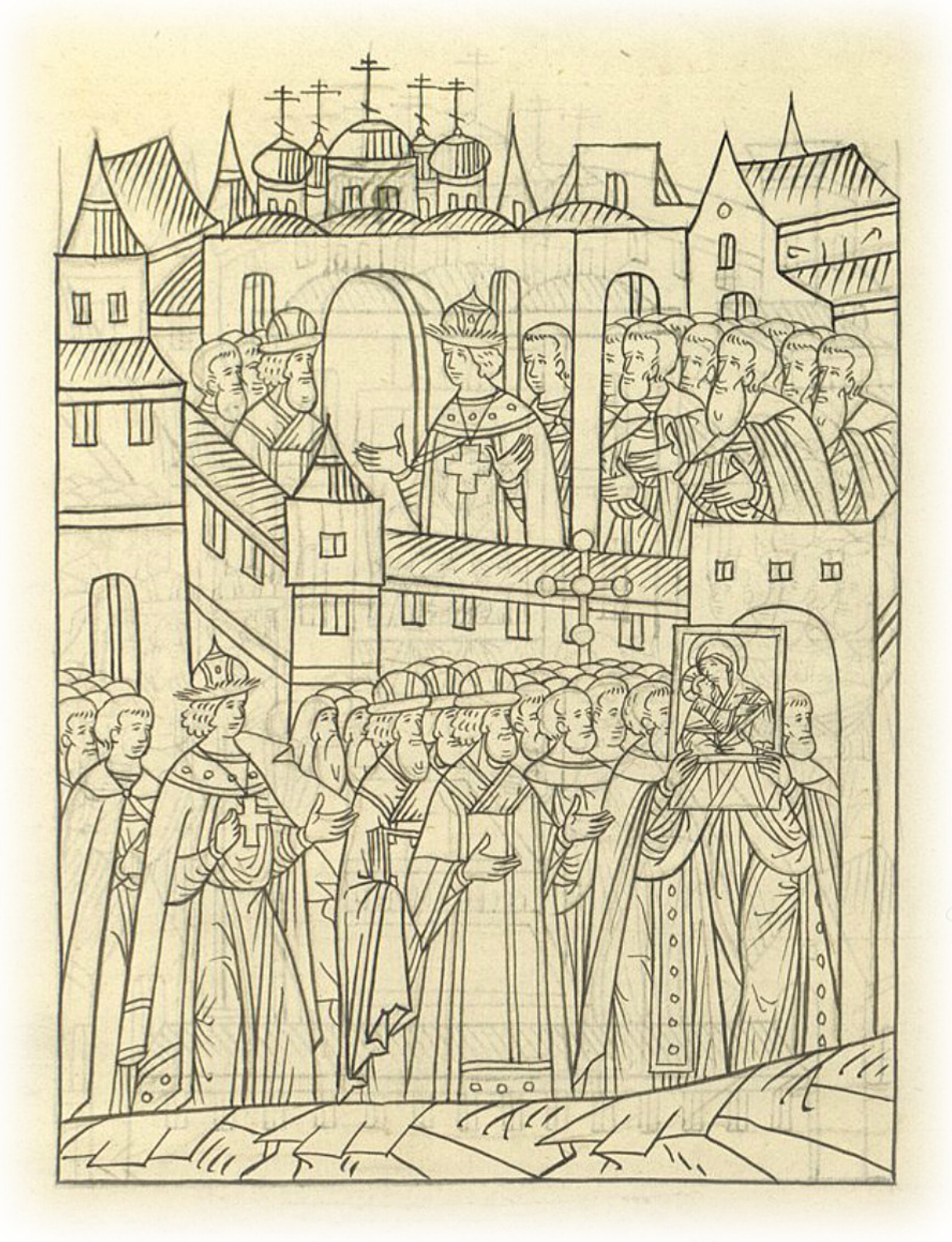 И пошел за крестами и за чудотворными иконами с митрополитом пешим в город, и пришел в соборную апостольскую церковь пречистой Богородицы честного Ее Успения.