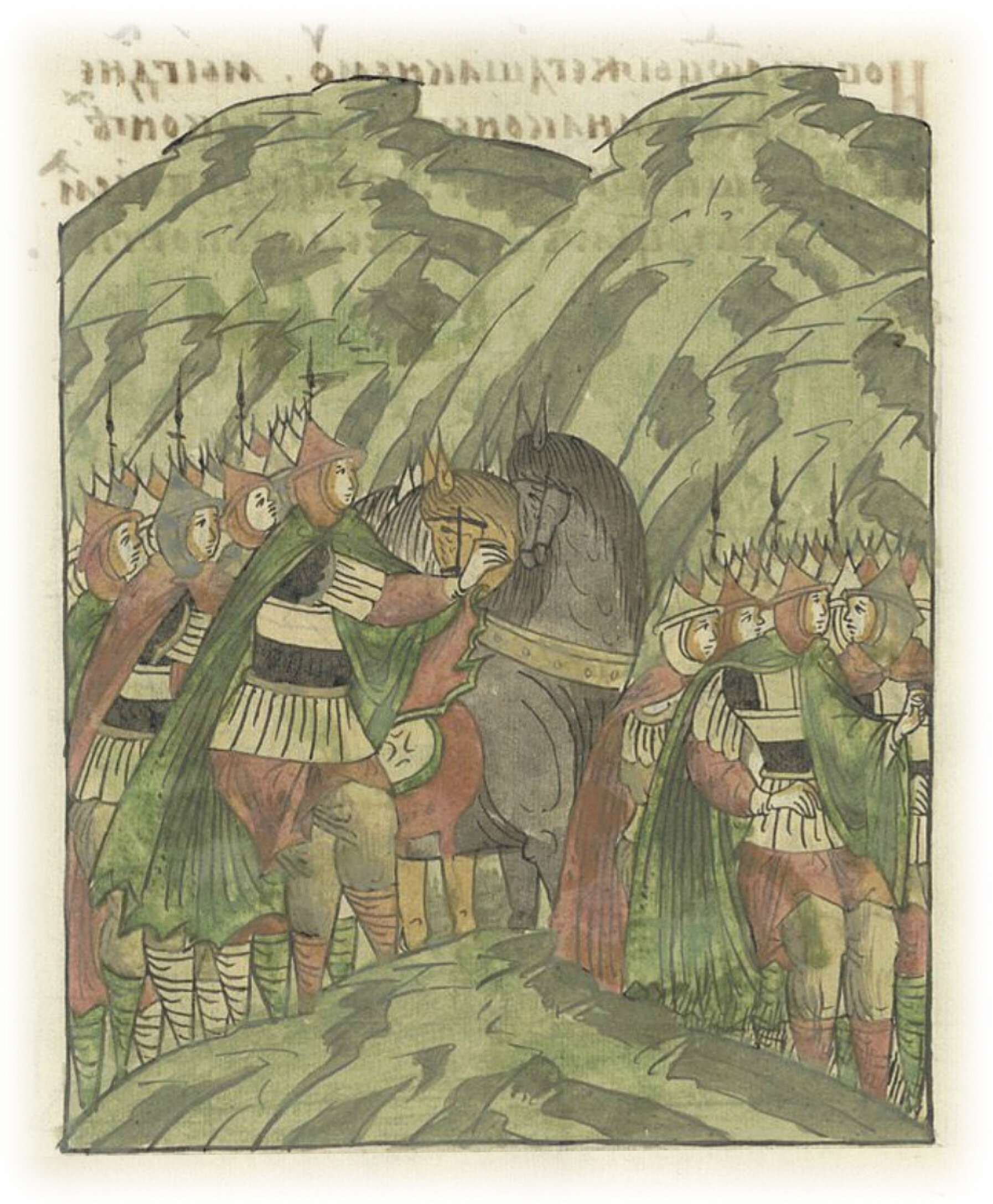 О побоище князя Ярослава Всеволодовича с князем Новгородским Мстиславом Мстиславичем у Липицы. Новгородцы сходят с коней и идут пешком, поскольку приходится идти через дебри.