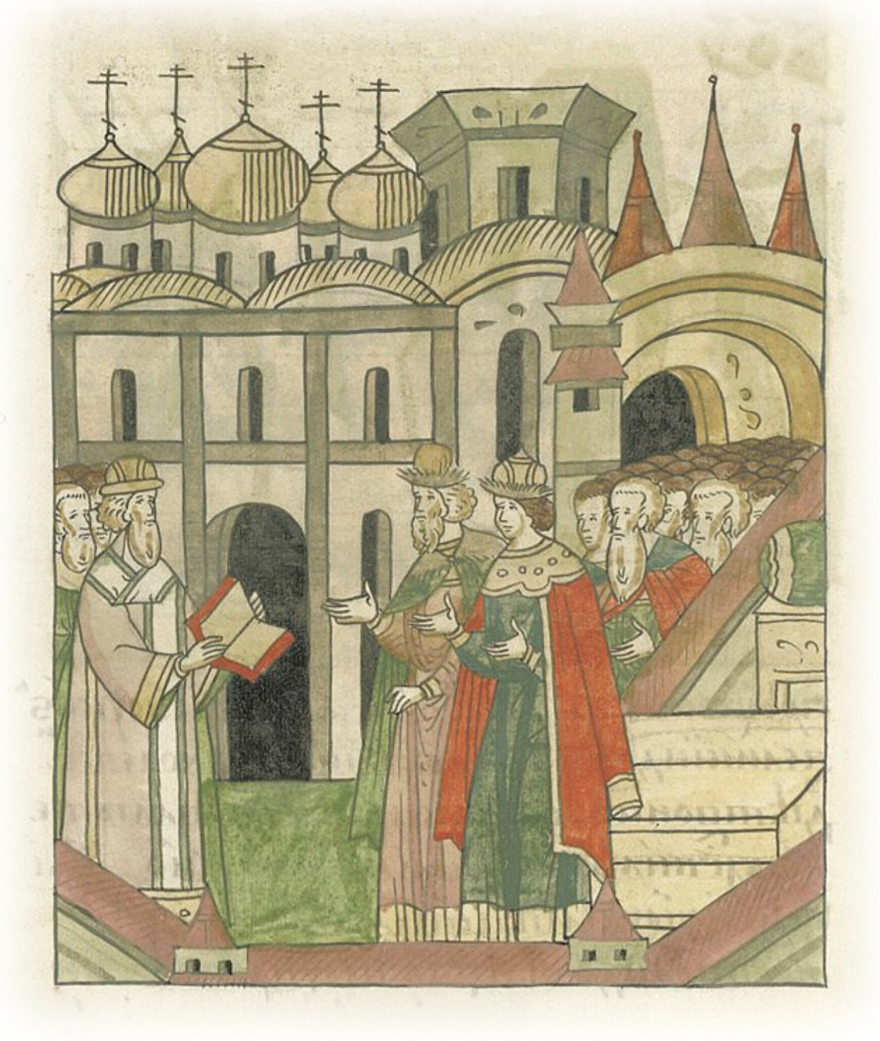 И потом митрополит с великими князьями сошли с помоста, и митрополит совершил отпуст молебну,