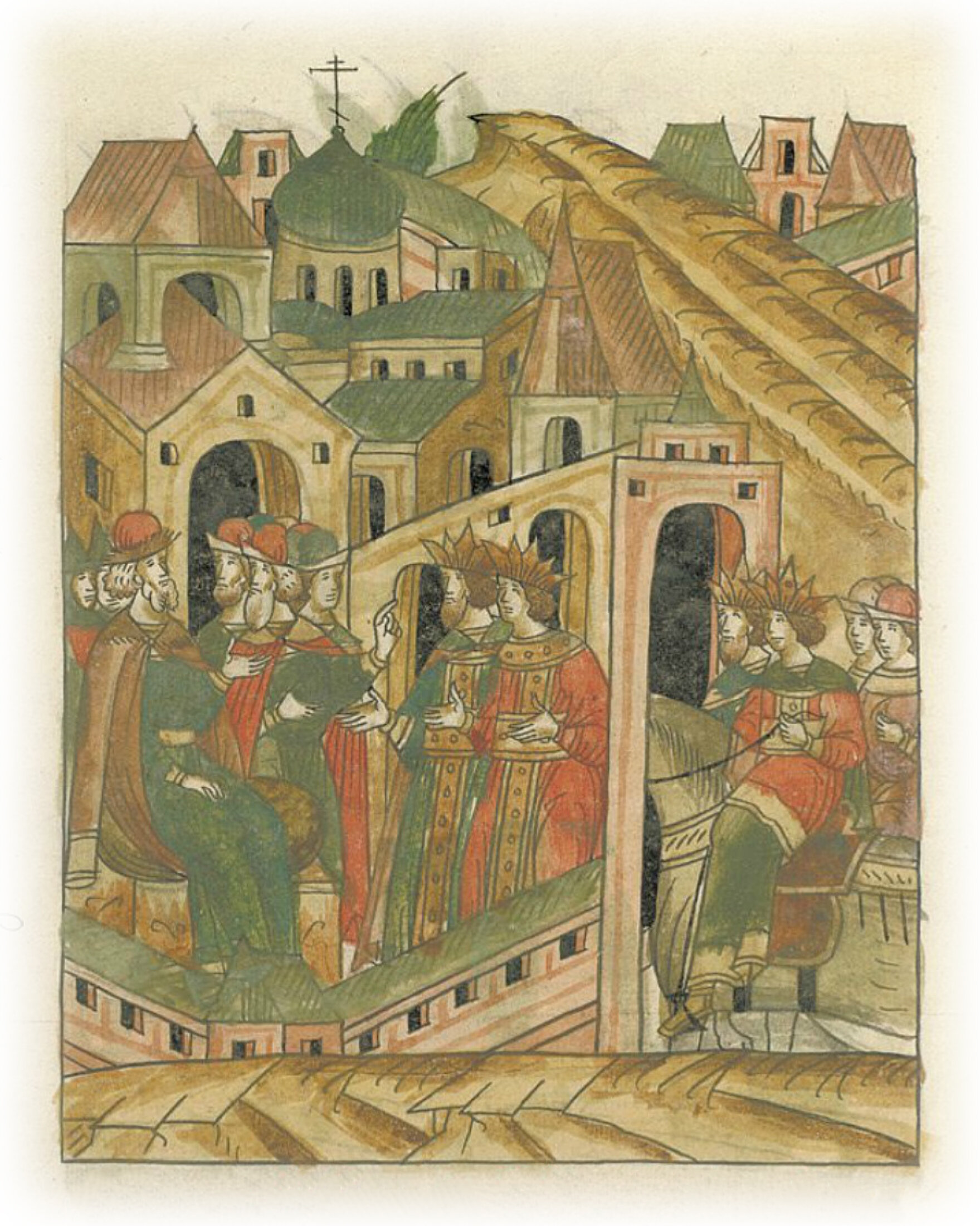 О приходе двух царевичей служить великому князю. В том же году пришли к великому князю служить два царевича из Астрахани, Исуп-Салтан, сын Язуб-Салтана, и Шигавлияр-Салтан, сын Бахтияр-Салтана, племянники царя Большой орды Ахмата.