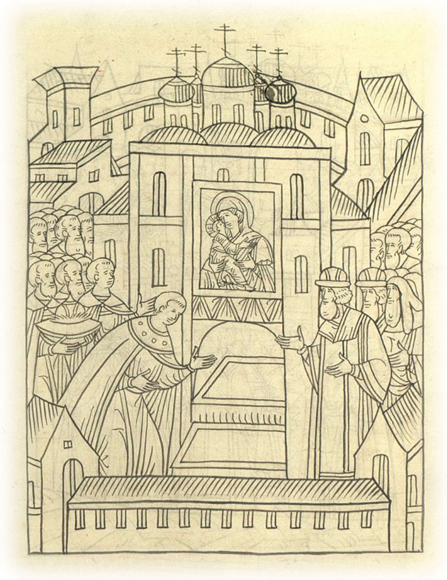 И припадает к чудотворному образу Богородицы, который написал божественный апостол Лука Евангелист, и к многоцелебным мощам Петра чудотворца и Ионы чудотворца и многие молитвы благодарные со слезами изрек, и,