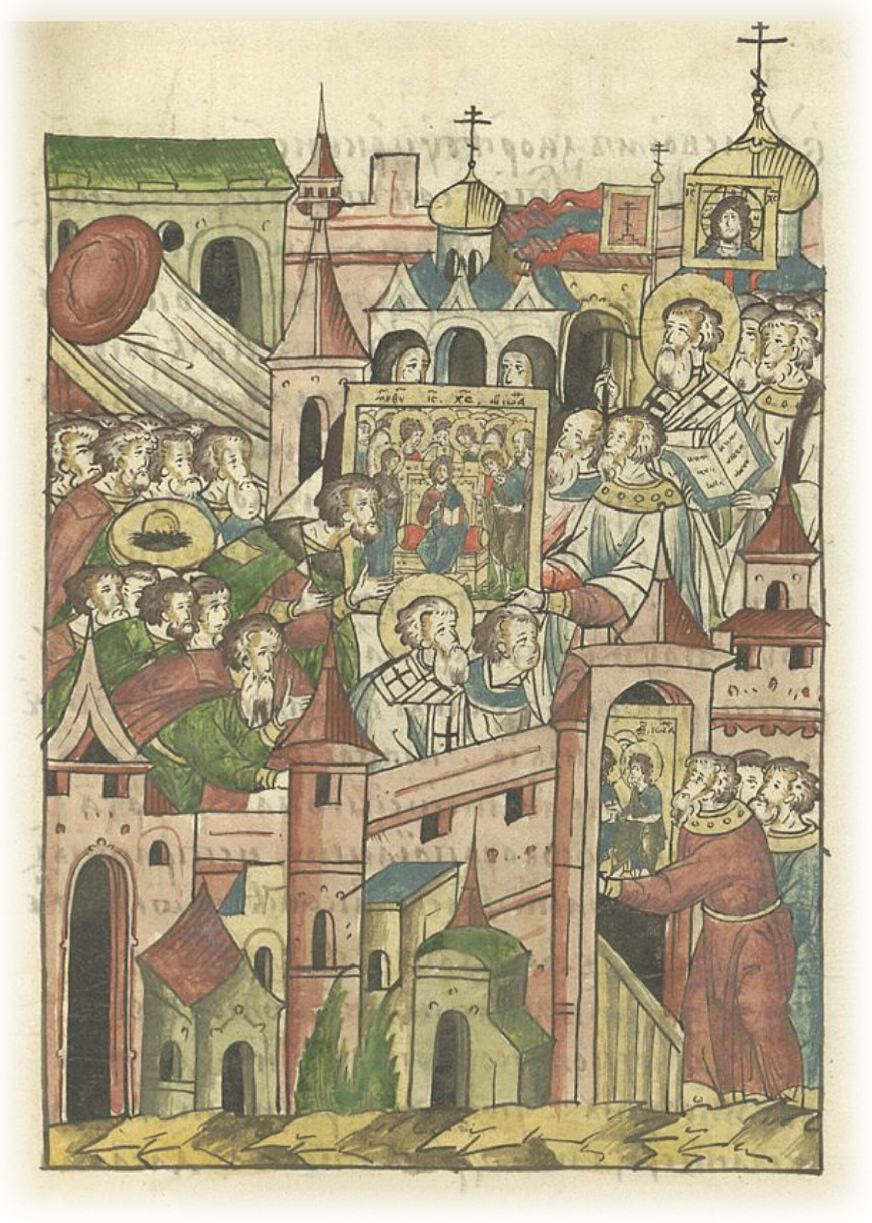 О великом князе Михаиле Александровиче Тверском. Великий князь встречает святую икону, принесенную в Тверь посланниками патриарха.