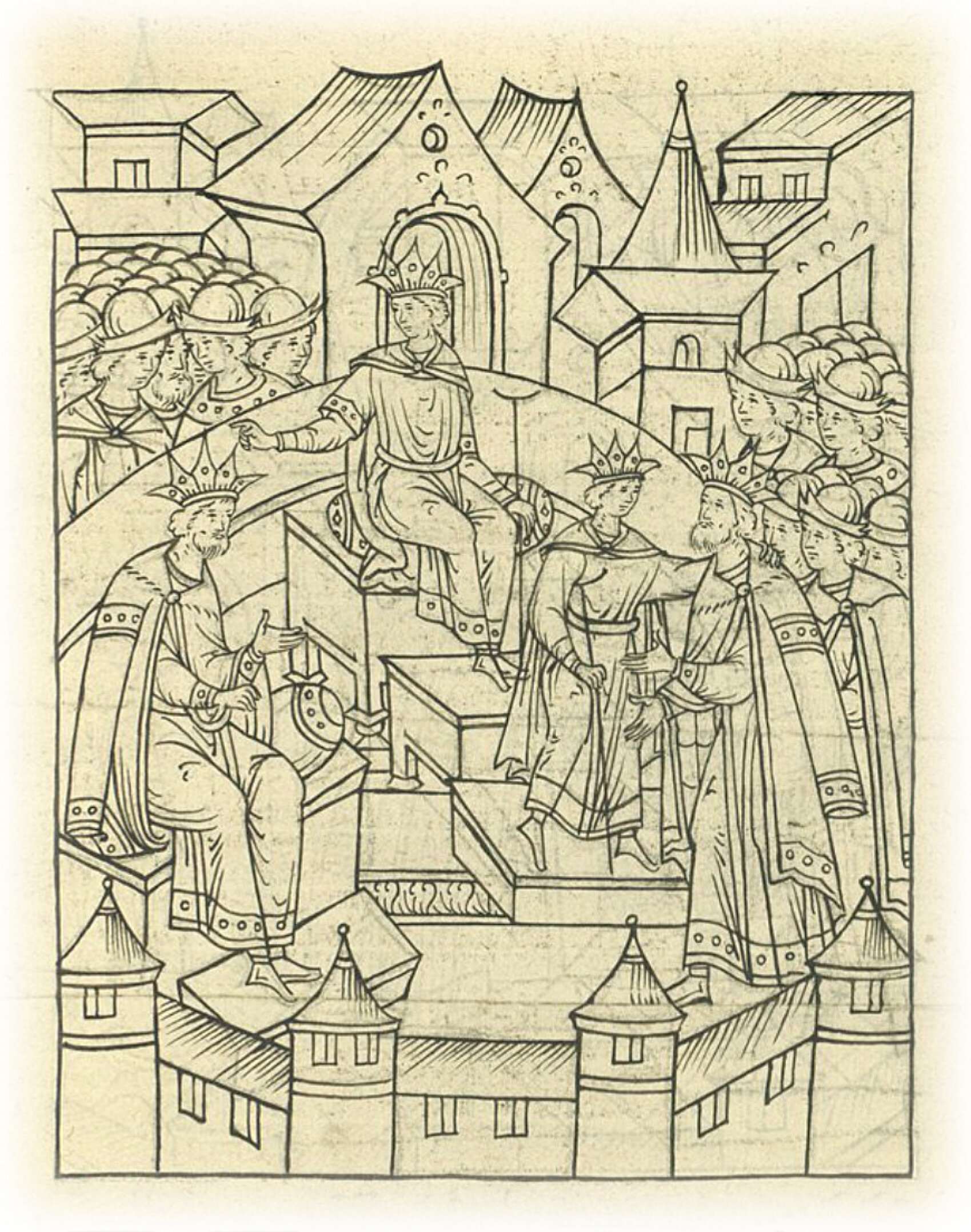 И князь великий велел царю встать, и пожаловал его великий государь, звал к себе царя карешеваться*, и велел ему сесть по правую руку от себя на другой лавке. * обмениваться приветствиями, пожимать руки (см. миниатюру).