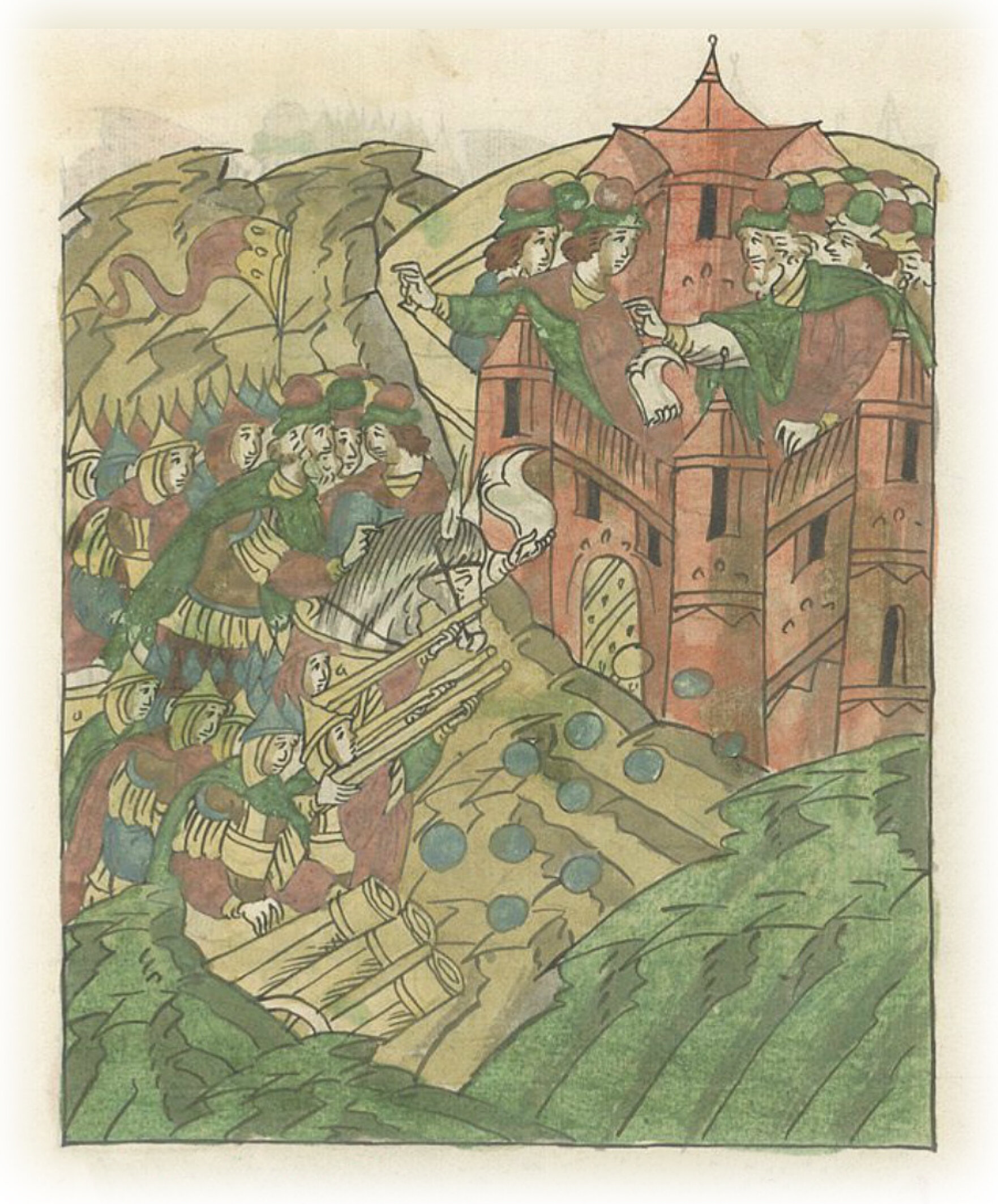 Языки говорят воеводам царя Ивана Васильевича, что магистр окопался большим рвом вокруг города Рындола, бьет из пушек и пищалей и приступает к Рындолу.