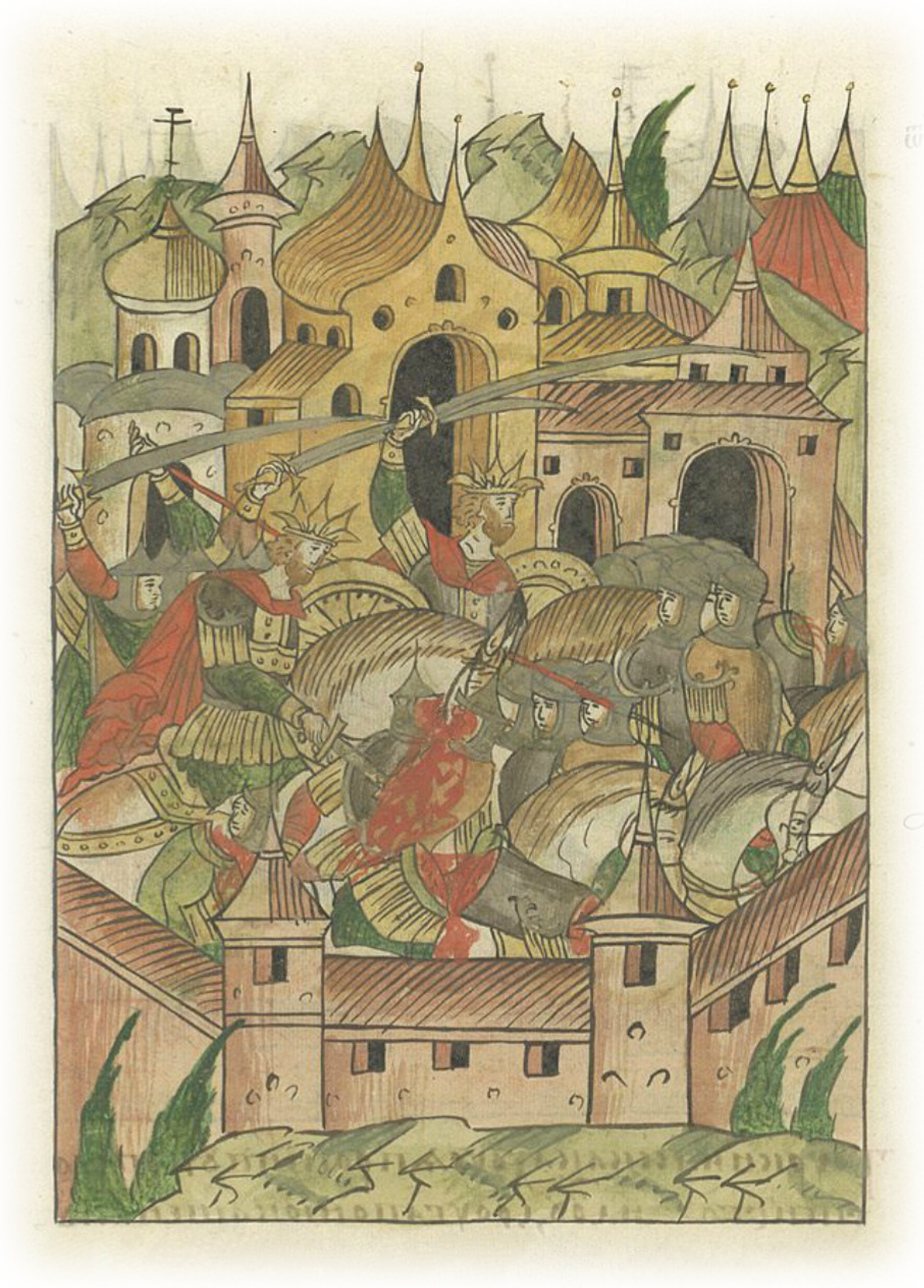 и если бы не поспешил к ним царь, окончательная была бы погибель городу. Царь же настиг турок и напал на них с избранными своими, и сек их нещадно и ужасно: которых достигал, рассекал надвое, а иных пересекал пополам, ничем не удержим был меч его.
