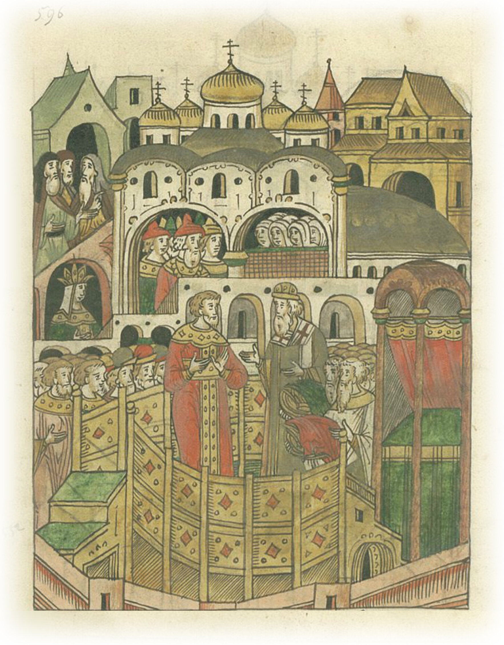 И сотворяя выход, патриарх взошел на священный амвон, и царь с ним, и принесли к патриарху царский венец на блюде, покровенный. Так же и царицын венец принесли к патриарху на блюде, покровенный.