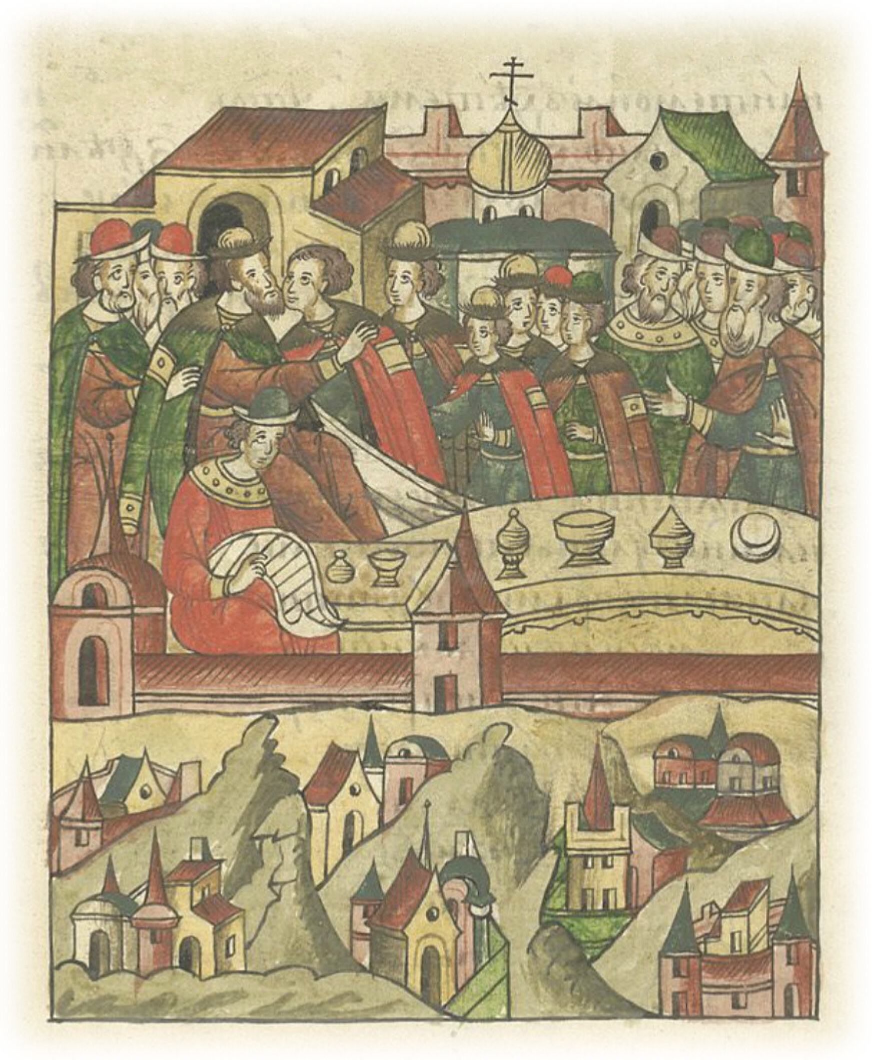 Напоследок он поцеловал детей своих, бояр, слуг и всех своих (людей, служащих ему), поучая детей своих, сказал: «Чада мои! Имейте в обычае своем благую любовь к Богу, милостыню раздавайте, правду любите, целомудрия и братолюбия держитесь». И завещал им брату брата любить и чтить, а не обижать, а старшего брата им всем слушать. Боярам же своим сказал: «А вы, братья, напоминайте моим детям, чтобы в любви жили, как я указал им». И выделил им каждому часть от своей отчины: сыну, князю Ивану, и его детям – Александру и Ивану – Тверь, Новый городок*, Зубцов, Радилов, Вбрань, Опоки, Вертязин. А князю Василию и Борису, и сыну его Ивану – Кашин, Коснятин. А сыну Феодору – два городка Микулины с волостями, и написал грамоту духовную, по которой им княжить и жить, не преступая моего слова и грамоты духовной. * Старица.