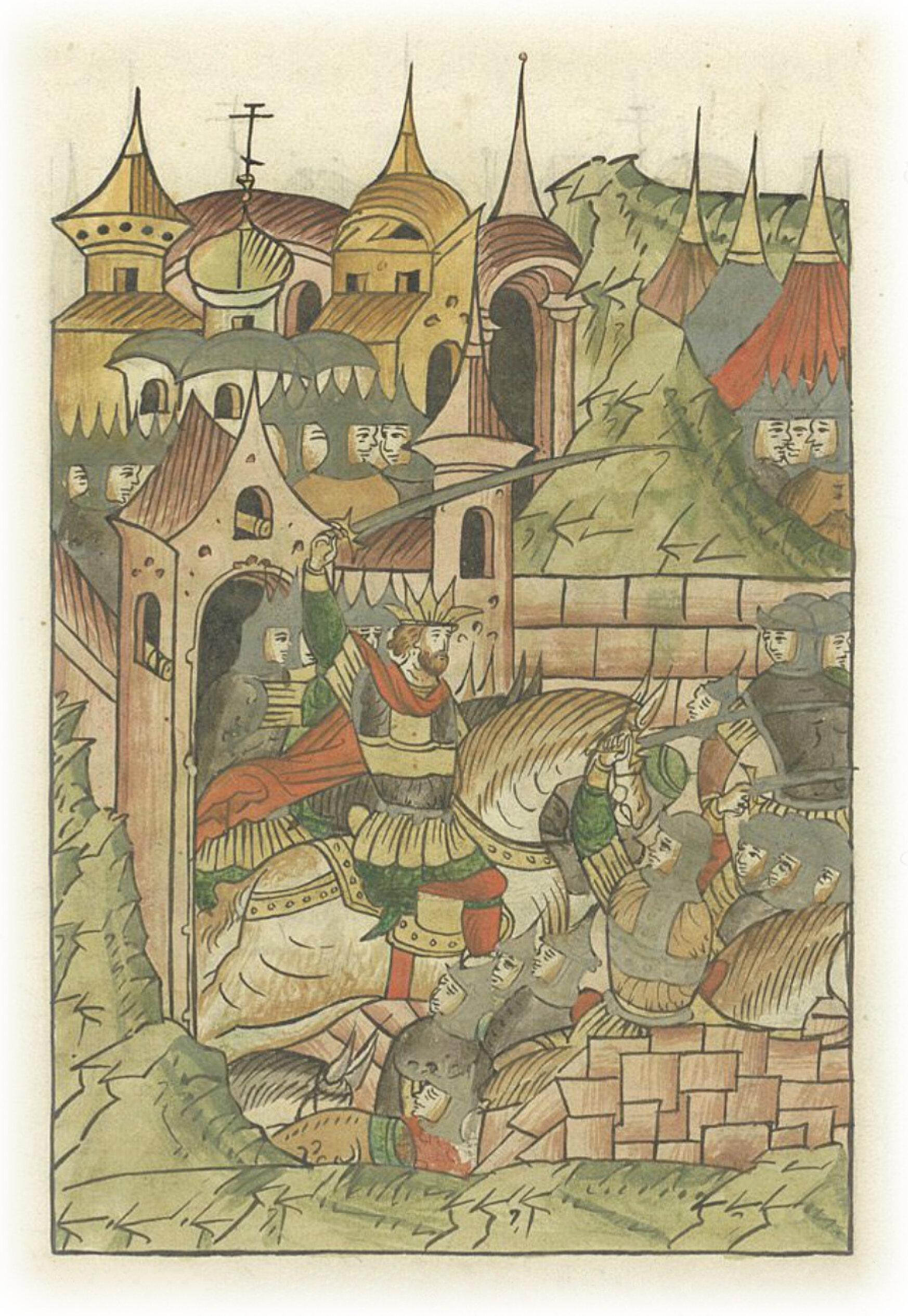 Царь же один, имея меч в руке, сек их; и бежали от него из города к разрушенному месту; и там сгрудились, и побили тут турок многих,