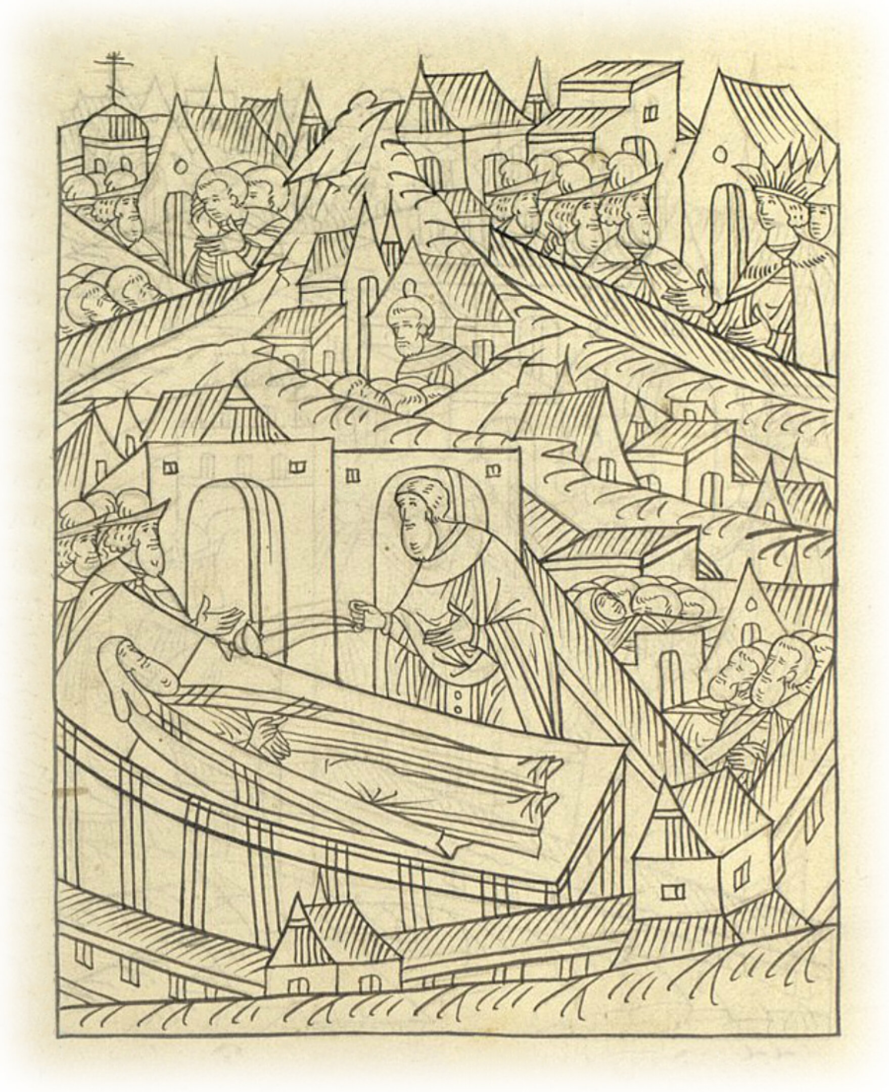 А в шестьдесят первом году и в шестьдесят втором году было Божье наказание во Пскове и в Великом Новгороде – великое поветрие, и по примерному подсчету в Новгороде и в пятинах умерло поветрием пятьсот тысяч человек: наказывая нас, Бог приводит нас к спасению. И преставился владыка Серапион, не стало из-за поветрия и дворецкого Василия Машуткина и много священнического чина, и приказных людей. Текст приписки скорописью на полях рукописи: третьей недели Поста, (месяца) марта 1 дня, разболелся царь и великий князь всея Руси Иван Васильевич. И была болезнь его очень тяжка, и немногие люди знали о болезни его. И так был болен, что многим казалось: приближается конец его. Дьяк царя и великого князя Иван Михайлов напомнил государю о духовной. Государь велел духовную составить, ибо это всегда было у государя готово. Составив духовную, начал государю говорить о крестном целовании, чтобы князя Владимира Андреевича и бояр привести к целованию на имя царевича князя Дмитрия. Государь тем же вечером привел к целованию бояр своих Ивана Федоровича Мстиславского, князя Владимира Ивановича Воротынского, Ивана Васильевича Шереметева, Михаила Яковлевича Морозова, князя Дмитрия Федоровича Палецкого, дьяка Ивана Михайлова, да бояр Данила Романовича, Василия Михайловича Юрьевых. А боярин князь Дмитрий Иванович Курлятев разнемогся, не целовал, а целовал только на третий день, как уже мятеж прошел; а казначей Никита Фуников разнемогся рано, и встал только тогда, когда государь гораздо оздоровел, и тогда целовал, после всех людей. А про князя Дмитрия Курлятева да про Никиту Фуникова говорили, будто они ссылались с княгиней Ефросиньей и с сыном ее с князем Владимиром, и хотели его на царство, а царевича князя Дмитрия из-за его младенчества на царство не хотели. А боярин князь Дмитрий Федорович Палецкий после целования посылал к княгине Ефросинье и к сыну ее князю Владимиру зятя своего Василия Петрова, сына Борисова Бороздина; за ним (замужем) была сестра князя Дмитрия Палецкого, а Васильева сестра родная была (замужем) за князем Хованским, и дочь Хованского, а Василию племянница княгиня Ефросиния, мать князя Владимира. А посылал князь Дмитрий Василия вот для чего: так как судом Божьим, а государским царя и великого князя произволением взял брат царя и великого князя князь Юрий Васильевич дочь князя Дмитрия Палецкого, вот князь Дмитрий Палецкий и посылал Василия к княгине Ефросинье и сыну ее князю Владимиру, чтобы княгиня и сын ее пожаловали, князю Юрию Василиевичу и дочери его, князя Юрия княгине, дали удел по духовной грамоте великого князя, а они им, княгине Ефросинье и князю Владимиру, будут на царство не сопротивны, и служить им готовы. Да дворян, которые были у государя в думе, Алексея Федорова, сына Адашева, да Игнатия Вешнякова государь привел к целованию вечером же. А в то же время князь Владимир Андреевич и мать его собрали своих детей боярских, да начали им давать жалованье – деньги, и бояре о том князю Владимиру начали говорить, что мать его и он не хорошо делают: государь недомогает, а он людей своих жалует. И князь Владимир, и мать его начали на бояр негодовать и кручиниться, бояре же начали от них беречься и князя Владимира Андреевича к государю стали не пускать. В то время был в церкви у Благовещения, которая на сенях у царского двора, некий священни