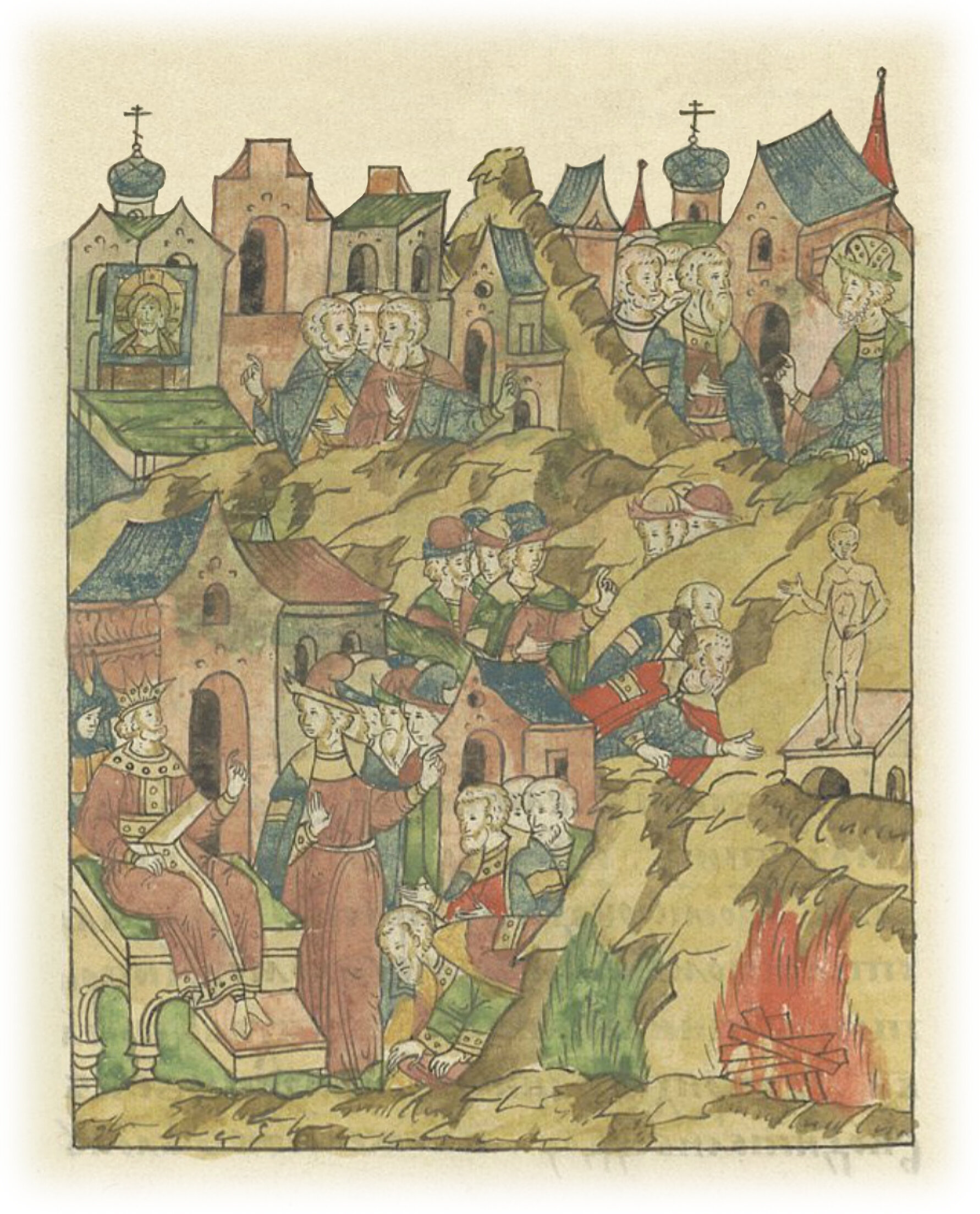 Хан Батый придумывает способ обращения князей в свою веру: велит устраивать волхование, и каждого из князей приводить к нему до тех пор, пока они не пройдут сквозь огонь и не поклонятся их идолам.