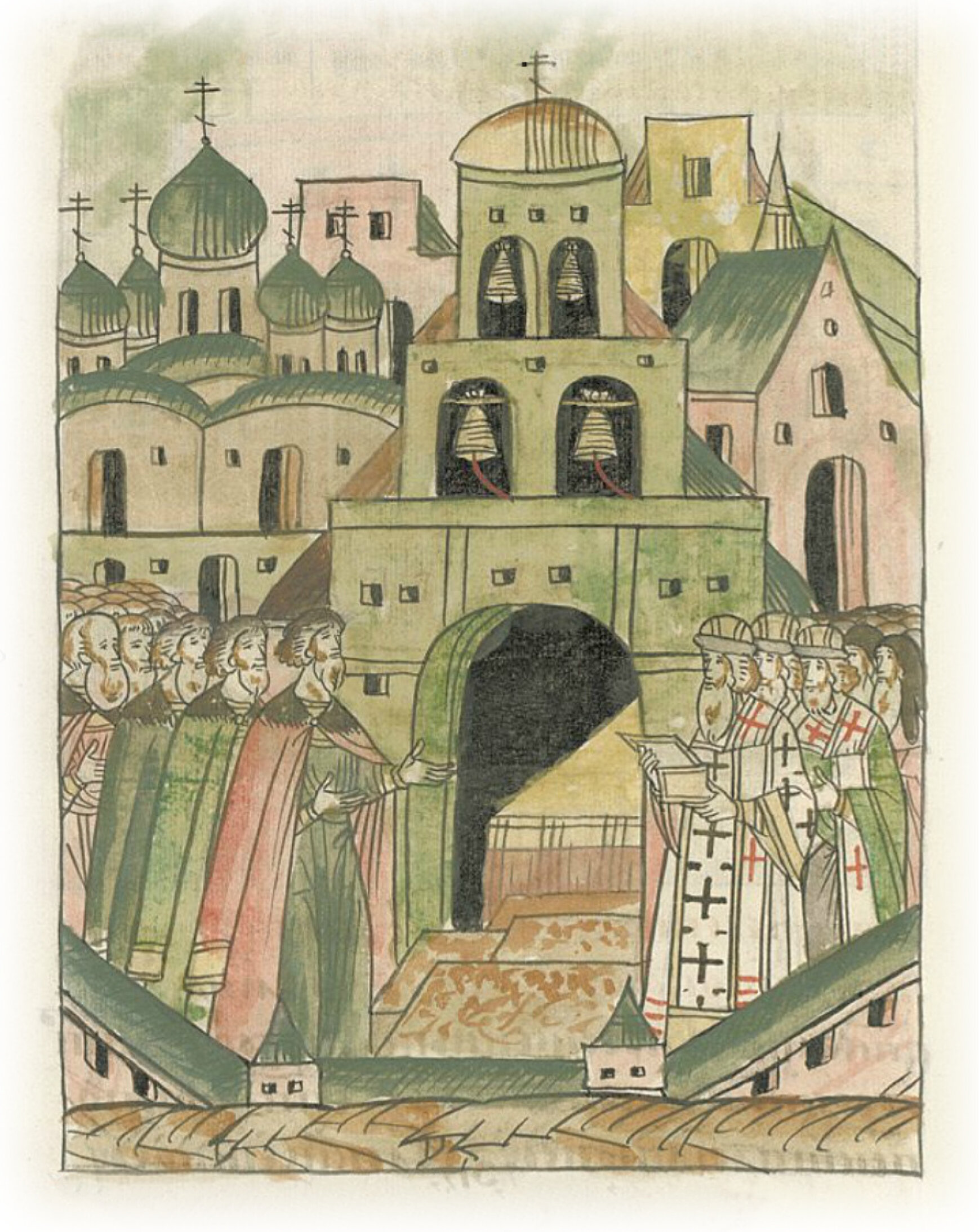 и тогда пришел благоверный и христолюбивый великий князь Иван Васильевич, Владимирский и Новгородский и всея Руси самодержец, и сын его великий князь Иван, а брат его князь Андрей Меньший тогда болен был, и все бояре и вельможи, и многое множество народа славного города Москвы; и совершают молебное пение.