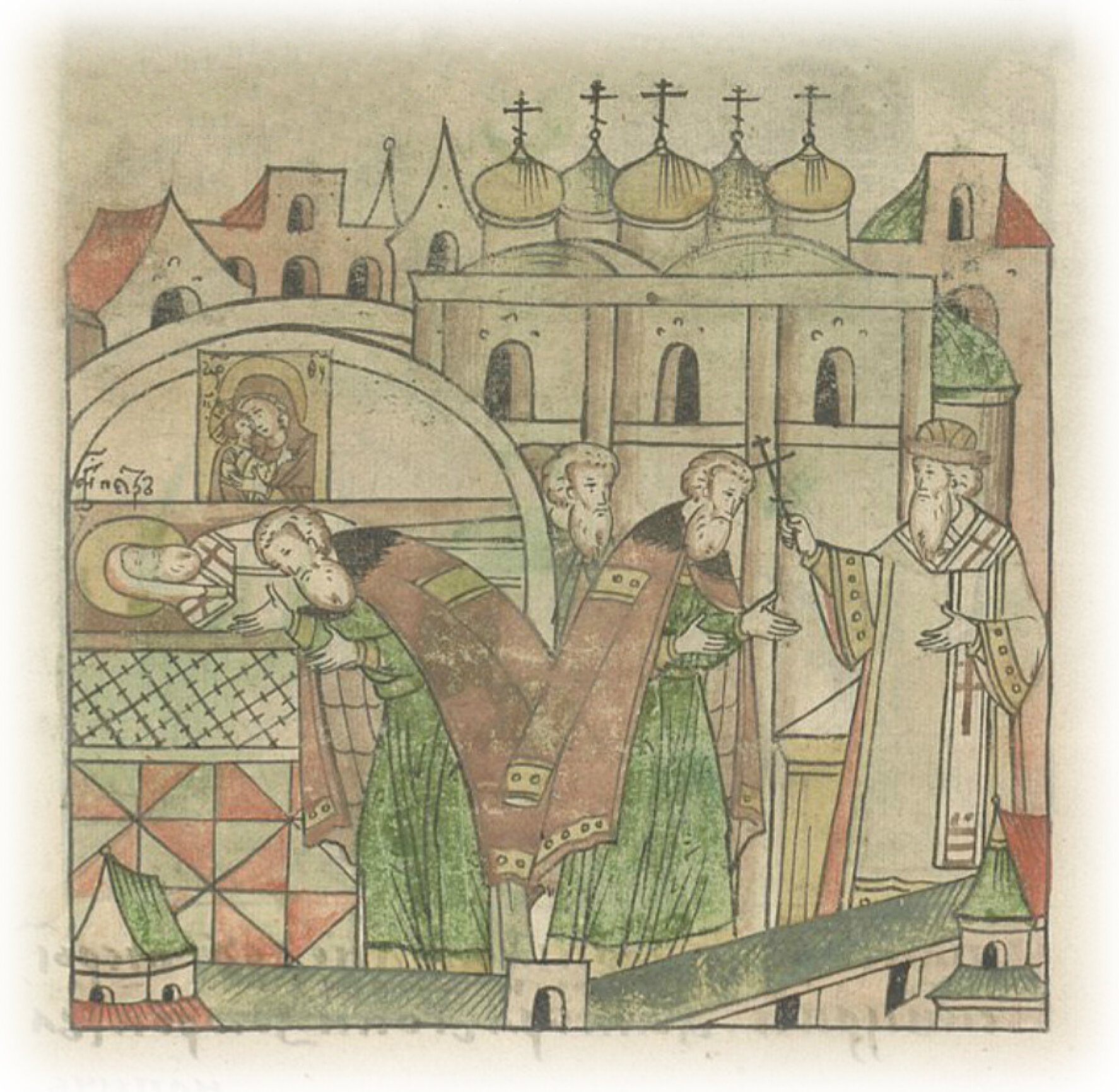 Великий князь Василий Иванович кланяется гробу чудотворца Петра и берет благословение у митрополита.
