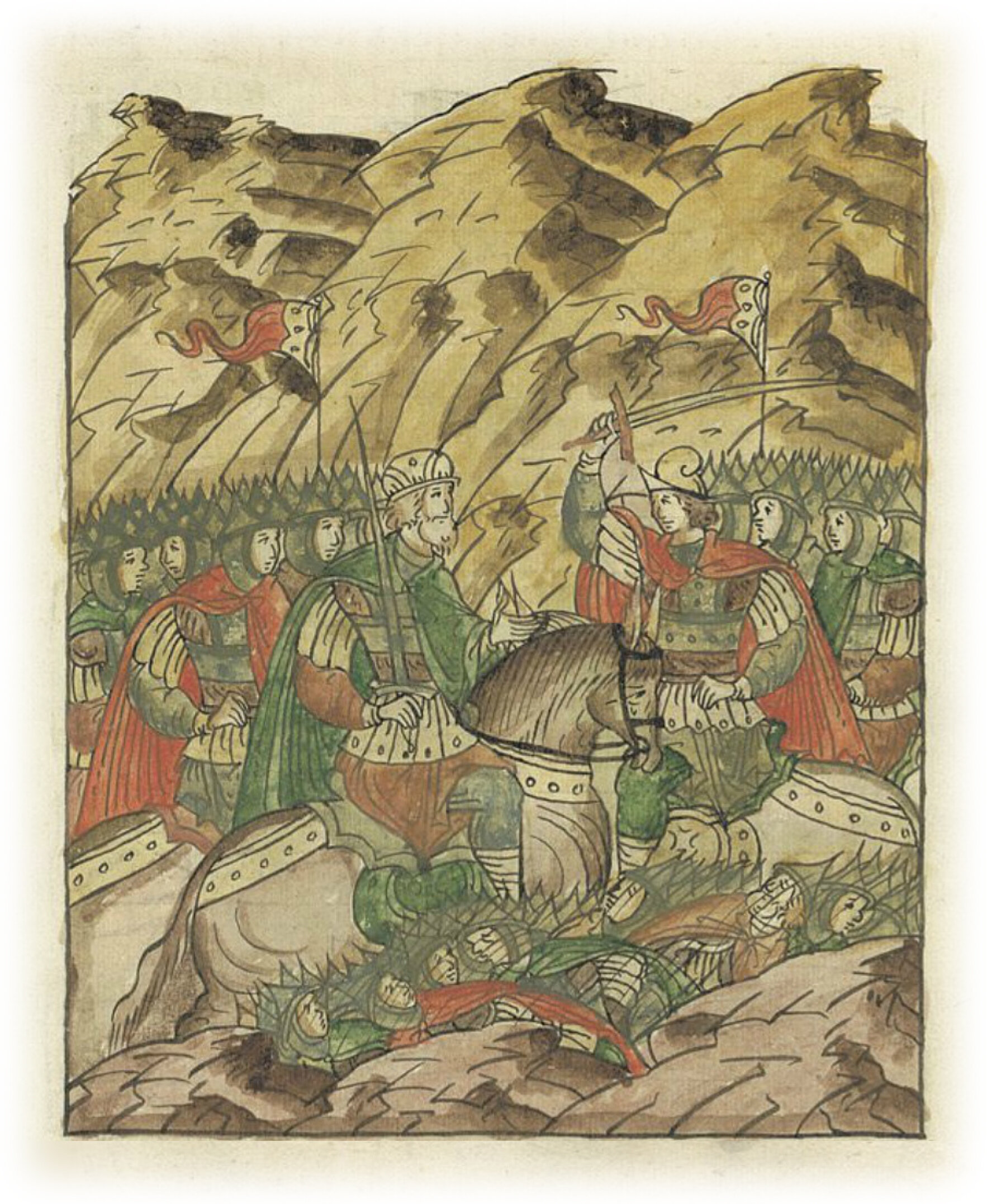 И пошел на него Александр Попович с мечом обнаженным, желая рассечь его, ибо силен и славен был этот богатырь. Он же возопил: «Я – князь Новгородский, Мстислав Мстиславич!» Тот же остановился тотчас и так спас его Бог от смерти. И сказал ему Александр Попович: «Княже! Ты не дерзай*, но стой и смотри! Если ты, глава, убит будешь, что делать всем, куда им себя деть?» И была сеча злая, и брань великая, и всюду мертвые лежали. * в смысле, не геройствуй.