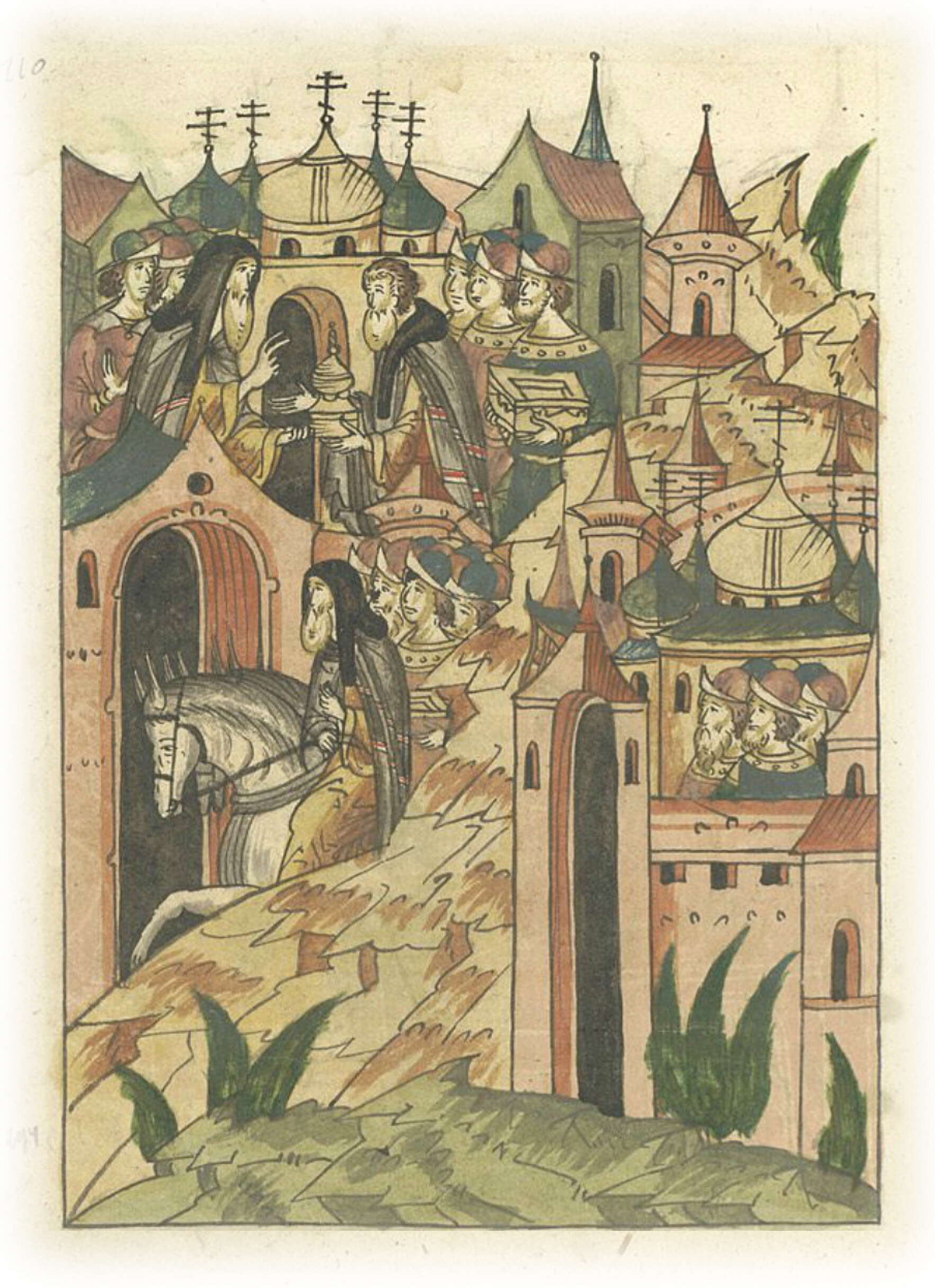 Новгородский архиепископ Василий приходит во Владимир к митрополиту Киевскому и всея Руси Феогносту с дарами.