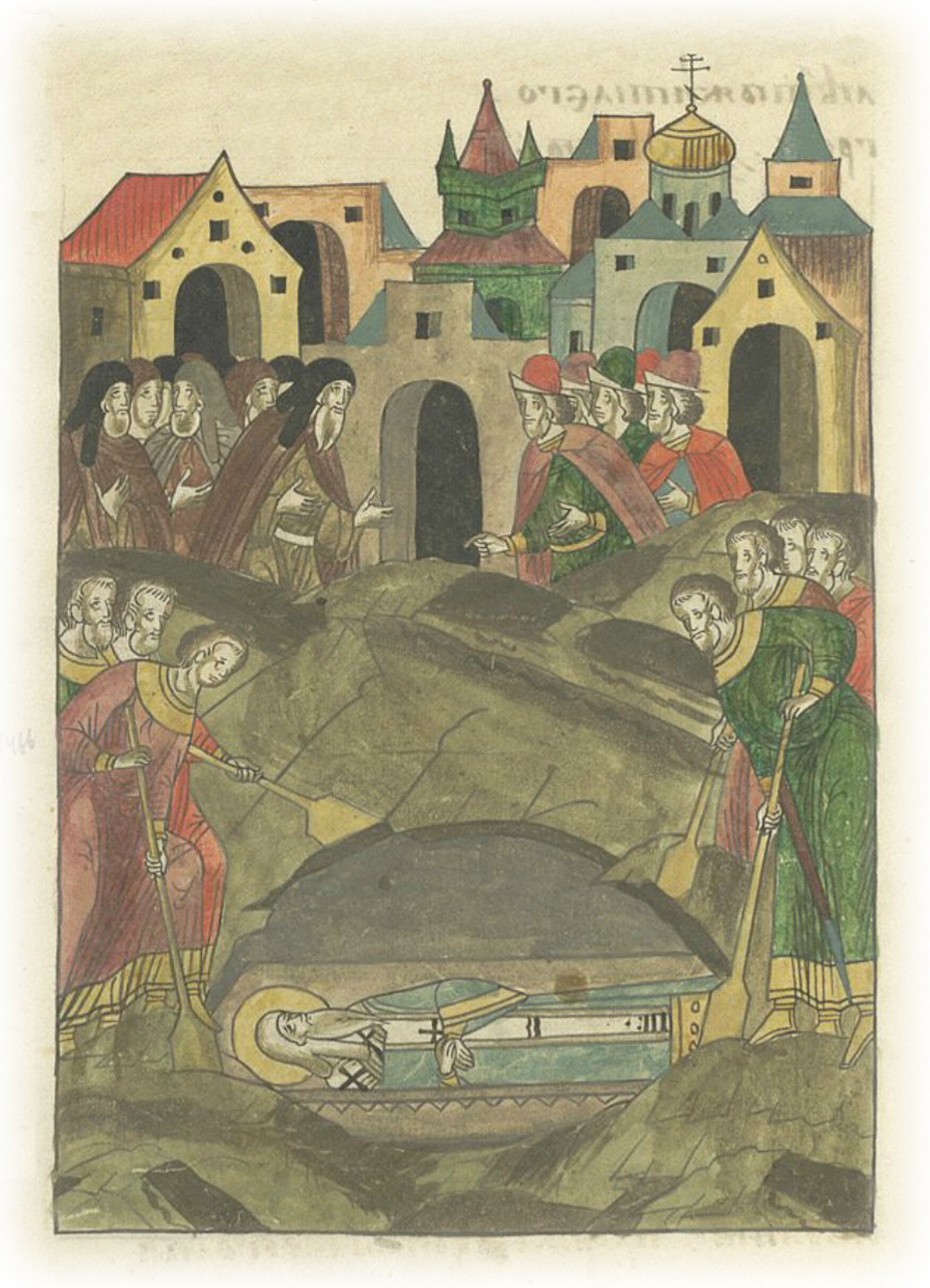 И начали раскопки, желая построить новую каменную церковь, и, когда копали, обрели священное тело Алексия, митрополита Киевского и всея Руси, и одежды его сохранились нетленными.