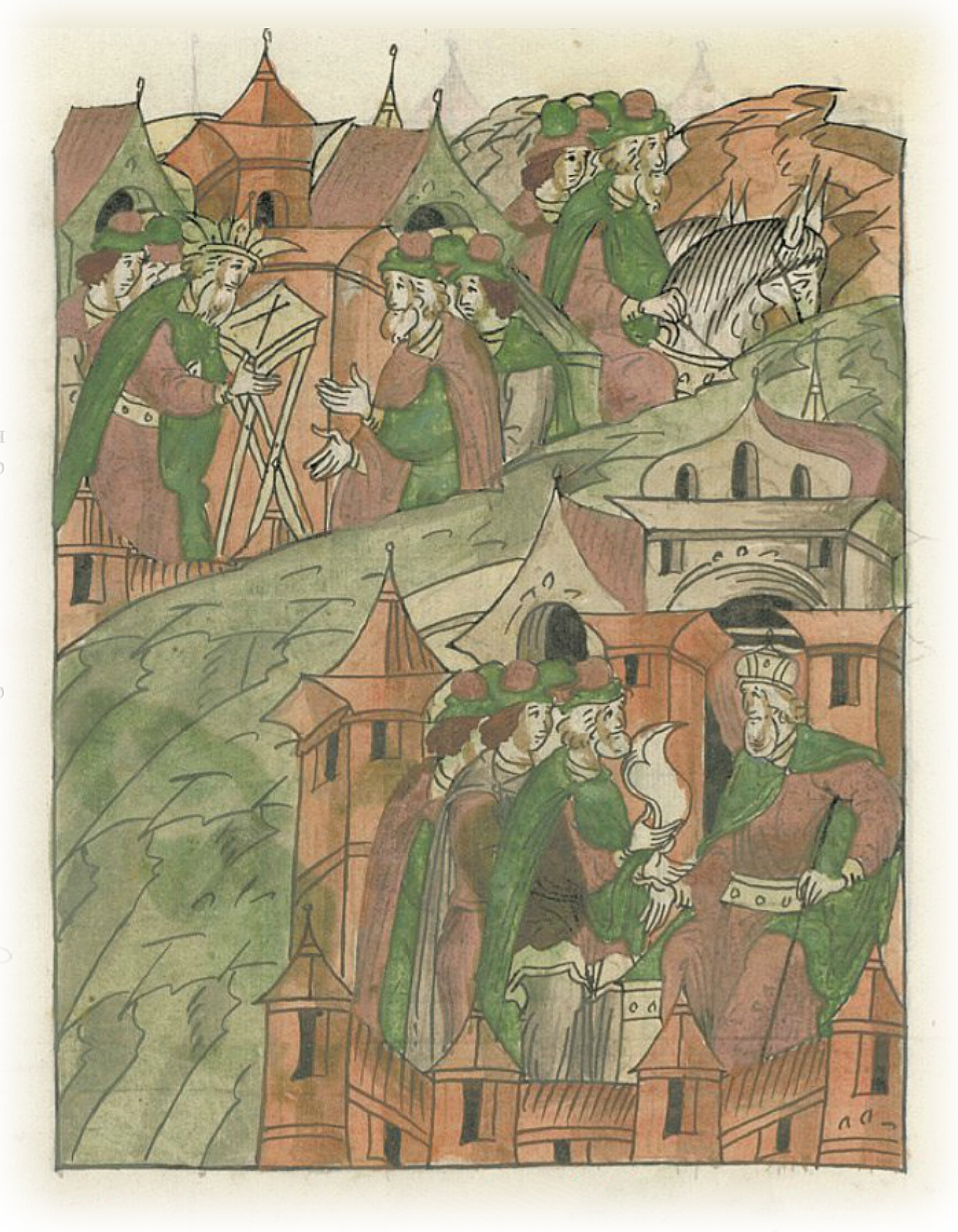Послы великого князя Василия Ивановича возвращаются из Рима с договорной грамотой цесаря Максимилиана и его послами, доктором Яковом и Маврецом.
