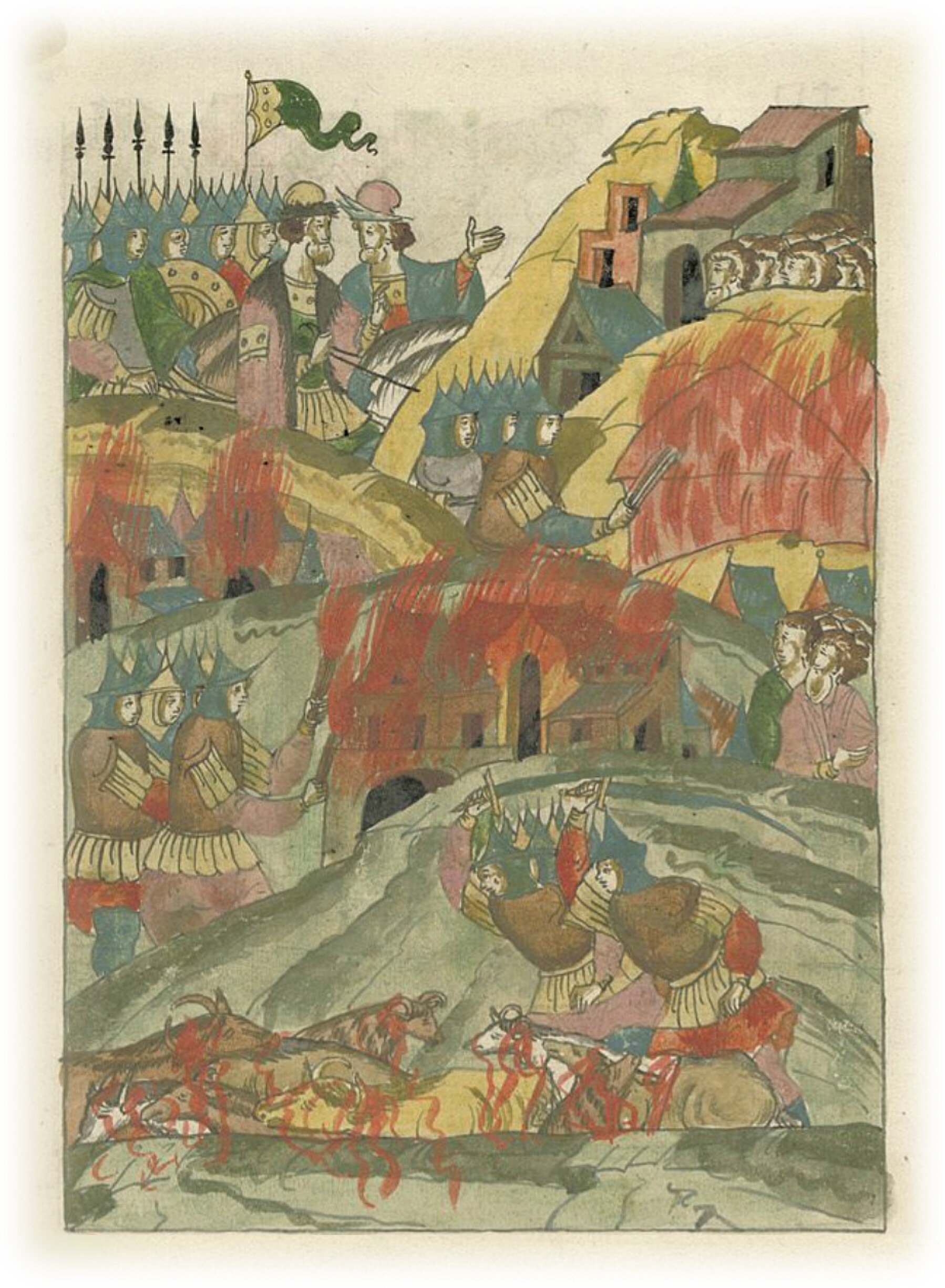 И вошли в землю Мордовскую в Пургасову волость, и жито пожгли и потравили, а скот избили, и села пожгли.