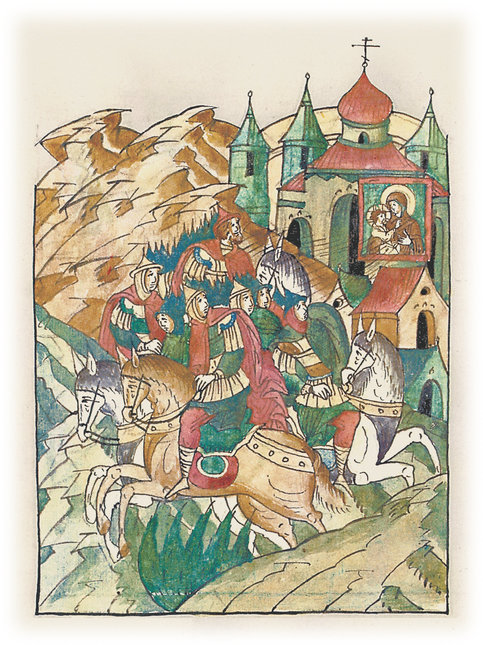 И когда пришли они на посад города Божьей Матери Семыни, к святой церкви Преображения Господня, и увидели от образа Пречистой Богородицы, что на иконе, пламя огненное исходящее и опаляющее их;