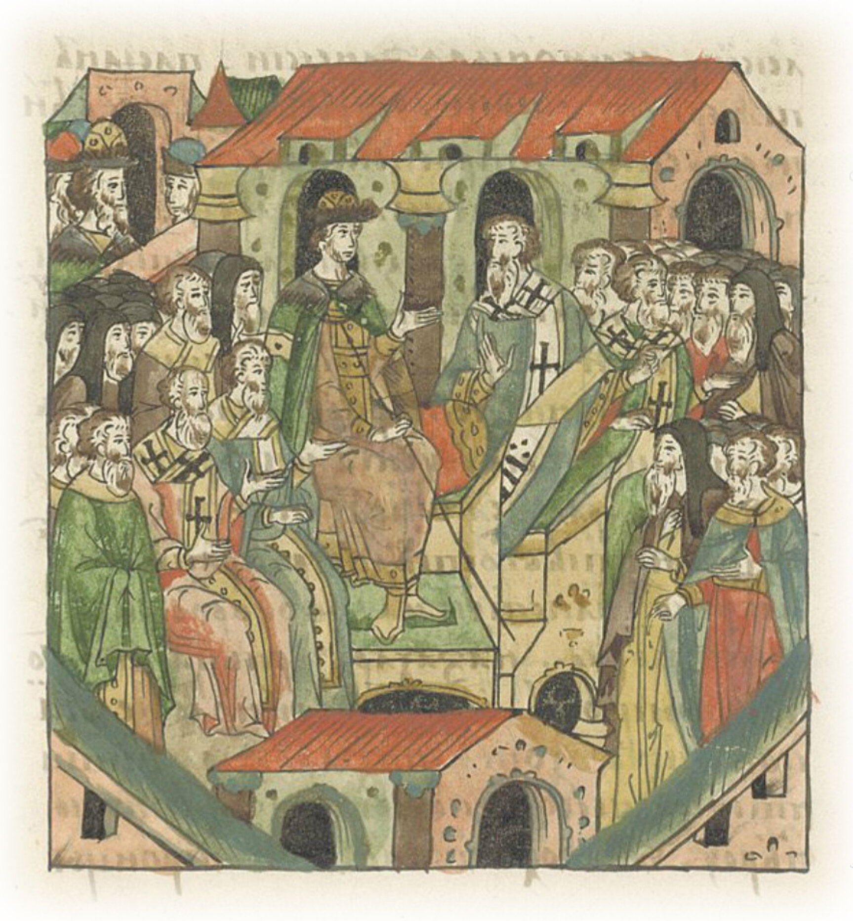 И в 6999 (1490) году (месяца) октября в 17 день повелением благочестивого и христолюбивого великого князя Ивана Васильевича, всея Руси государя и многих других (земель) самодержца и истинного поборника православия, созвали собор на митрополичьем дворе. И на этом соборе присутствовали: великий князь Василий Иванович вместо самодержавного отца своего, господин преосвященный Зосима, митрополит всея Руси, и архиепископ Ростовский Тихон, и епископы: Нифонт Суздальский, Симеон Рязанский, Вассиан Тверской, Прохор Сарский, Филофей Пермский, и игумен ТроицеСергиева монастыря Афанасий, и пустынники, и добродетельные старцы Паисий и Нил, и многие архимандриты, и игумены, и протопопы, и священники, и дьяконы, и старцы, и весь прочий освященный собор Русской митрополии. И так собрались они бороться за истину против тех бесстыдных развратников христианской веры, против новгородских еретиков, чернеца Захарию и его товарищей, и всех их единомышленников, желавших развратить чистую и непорочную православную веру во Христа Бога нашего в Троице славимого, и погубить Христово стадо – православное христианство, которого не одолели и не смогли одолеть, но были как камнем поражены, и сами были стерты и погибли, и вся мудрость их была поглощена, потому что многих простых людей прельстили своими скверными ересями.