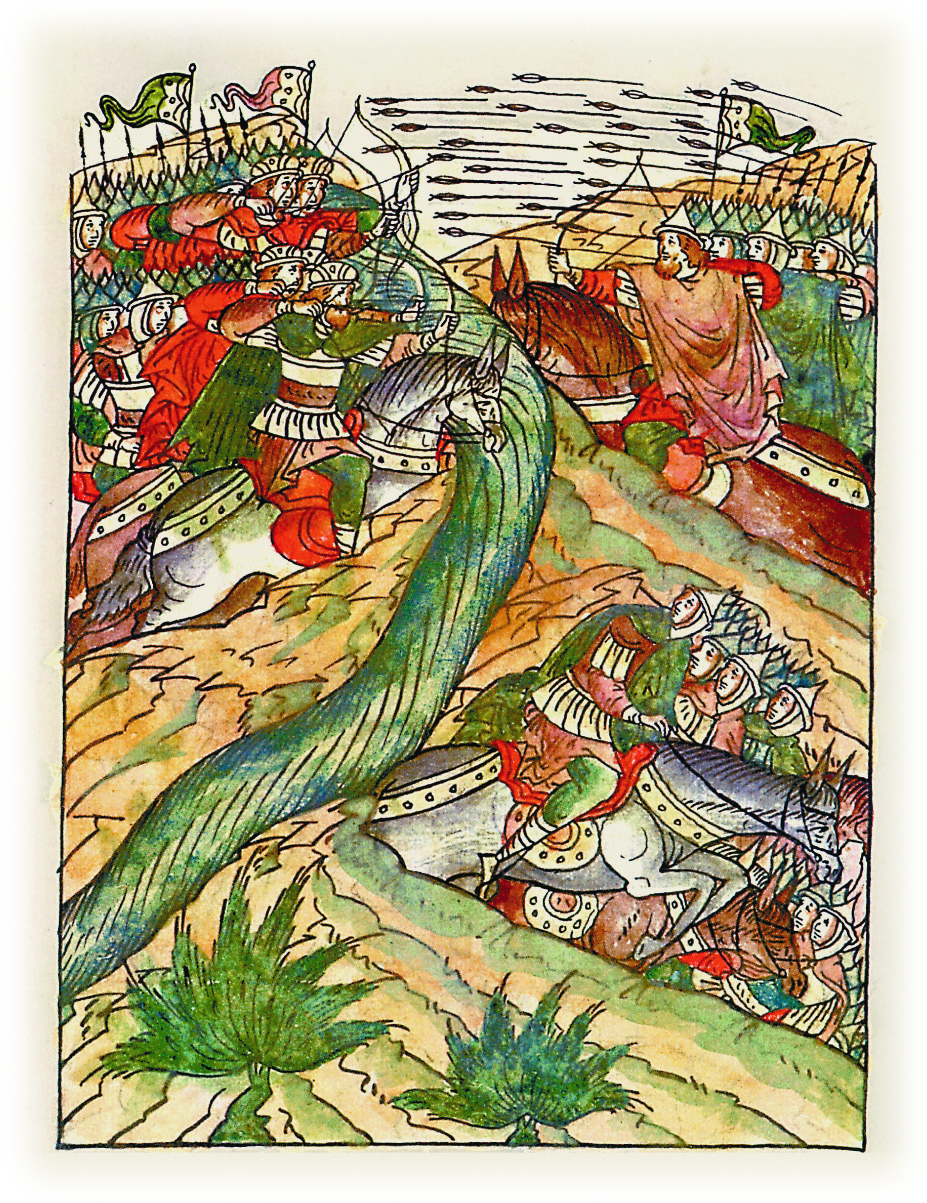 Князь же великий Изяслав Давидович и князь Глеб Юрьевич Мономаш, и половецкие князья Чемгура и Бердебек, и Темир, и прочие князья половецкие, и половцы спешно пришли на них, и начали через реку стрелы пускать как дождь сильный, такой, что и небеса не были видны в стрелах; и множество коней и людей стрелами побили.