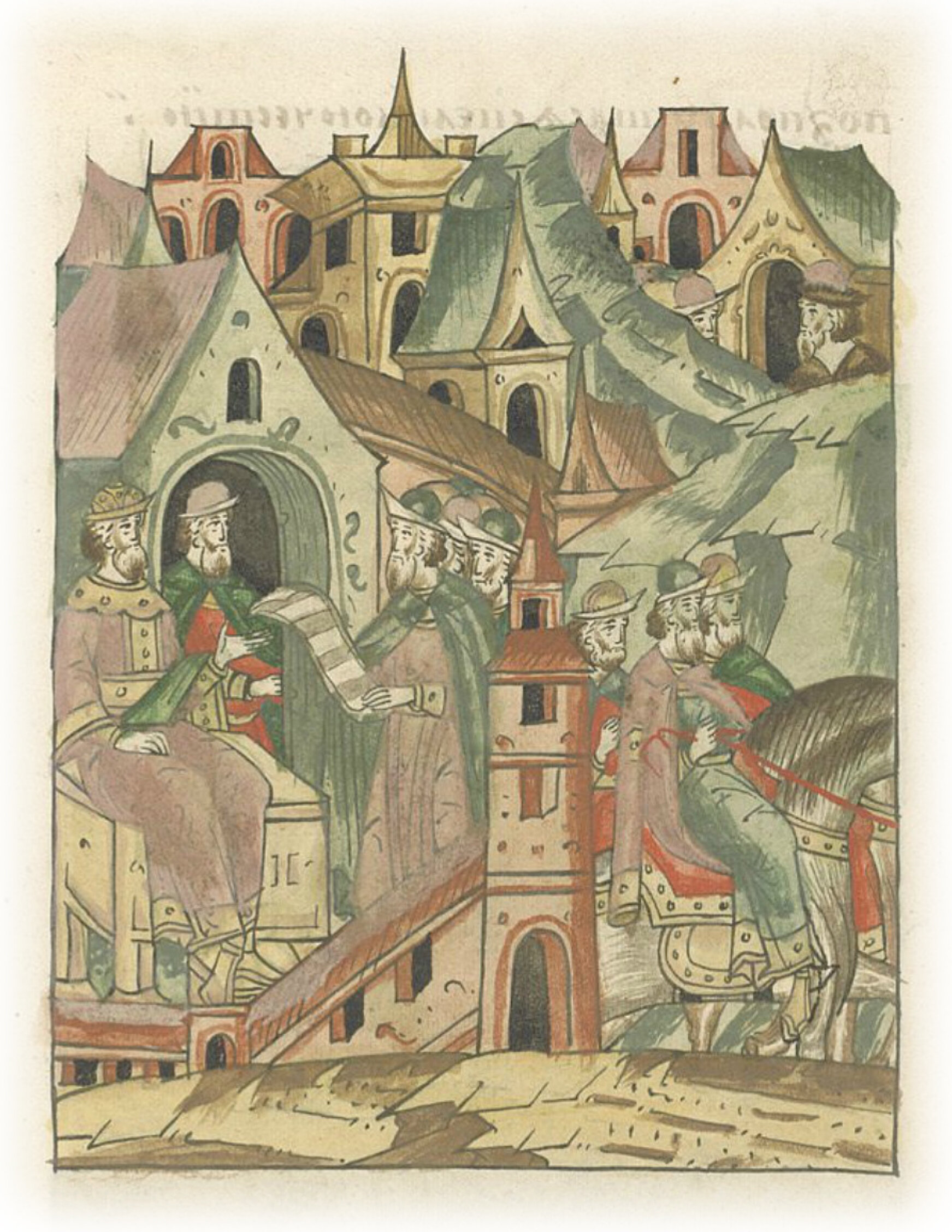 Послы великого князя Ивана Васильевича берут утвержденную Литовским князем Александром грамоту о том, что он оставить дочь великого князя Елену исповедовать греческую веру и повелит поставить у себя на дворе для нее церковь.
