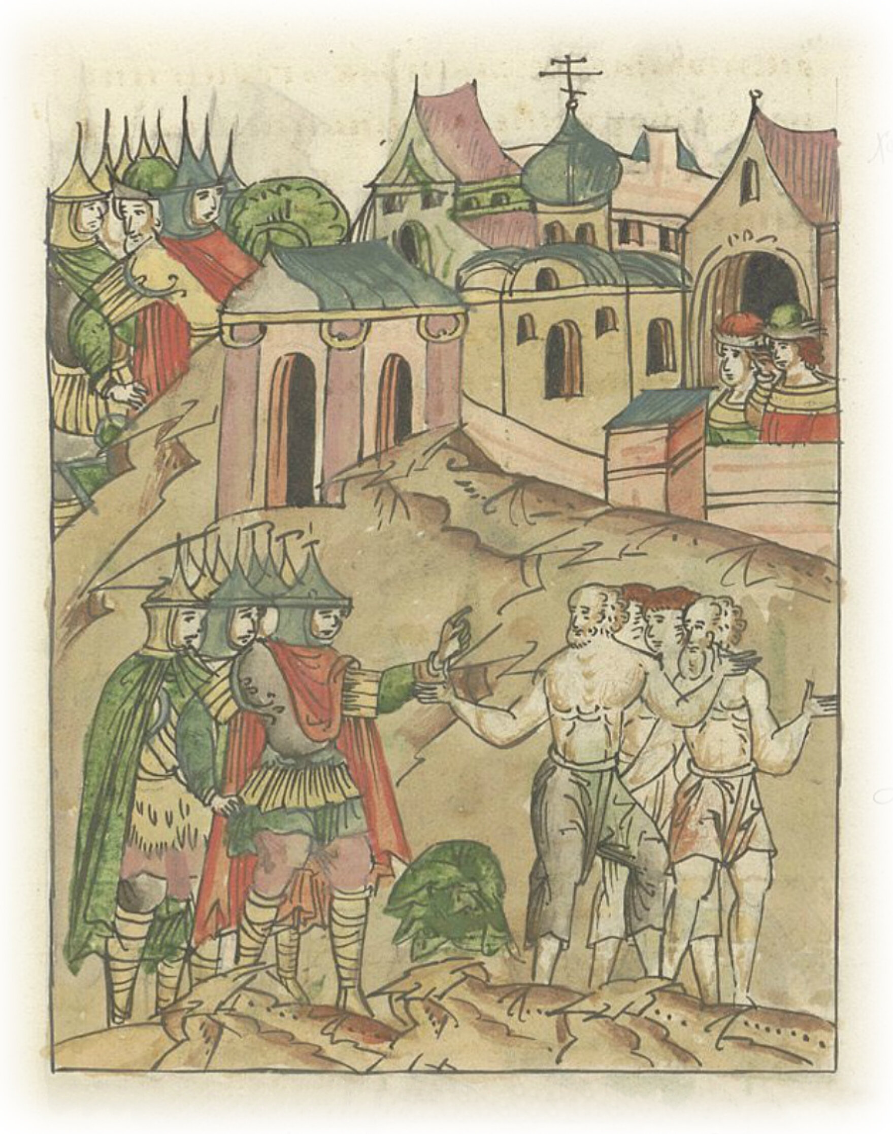 И бояр его всех схватили, а прочих всех, пограбив, нагими отпустили. А сыновья великого князя князь Иван и князь Юрий схоронились в том же монастыре. А кровопийцы эти, как некий сладкий улов уловив, отошли, а о них и не обеспокоились, даже и не спрашивали о них.
