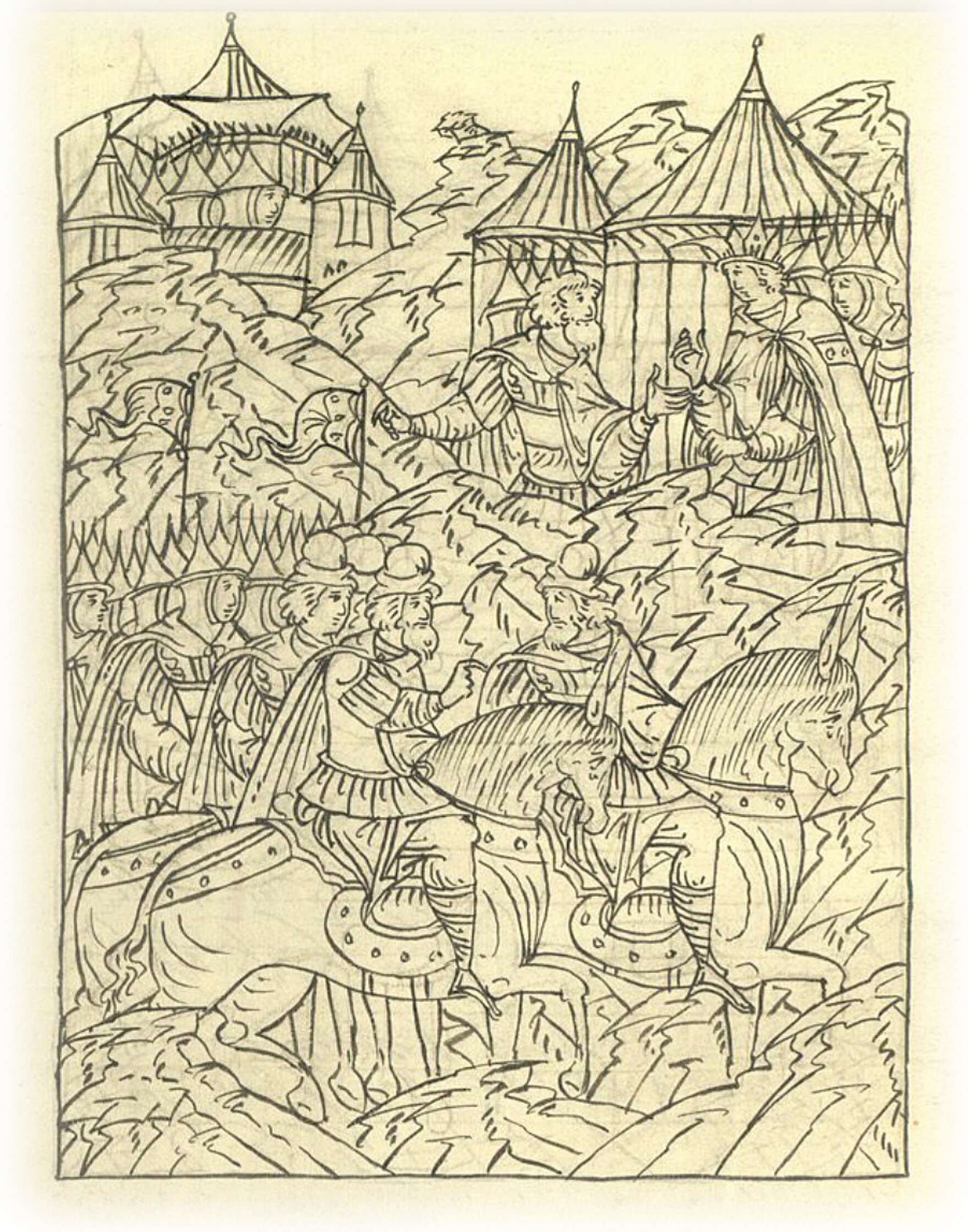 Языки говорят воеводам царя Ивана Васильевича, что магистр окопался большим рвом вокруг города Рындола, бьет из пушек и пищалей и приступает к Рындолу.