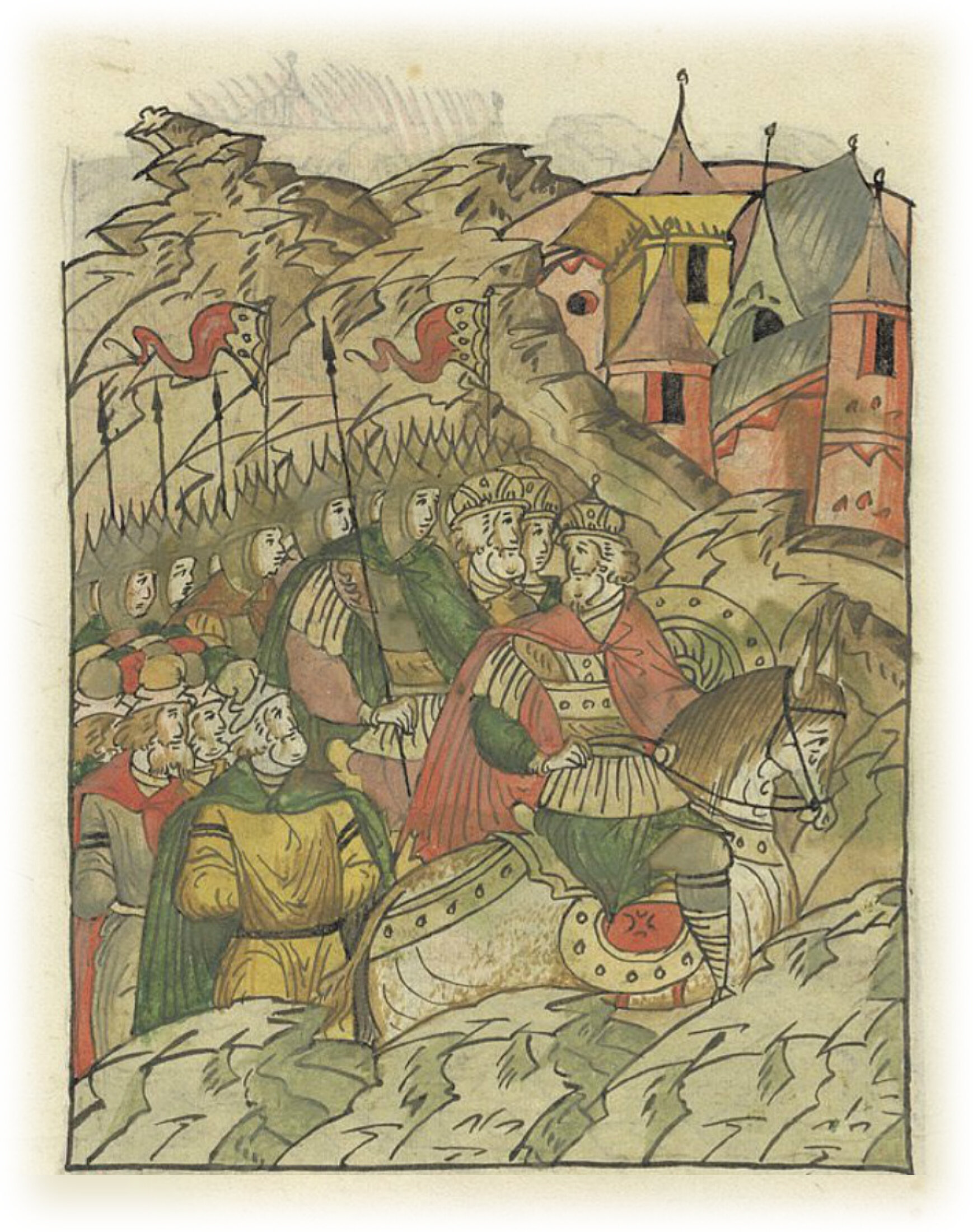 Языки говорят воеводам царя Ивана Васильевича, что магистр окопался большим рвом вокруг города Рындола, бьет из пушек и пищалей и приступает к Рындолу.