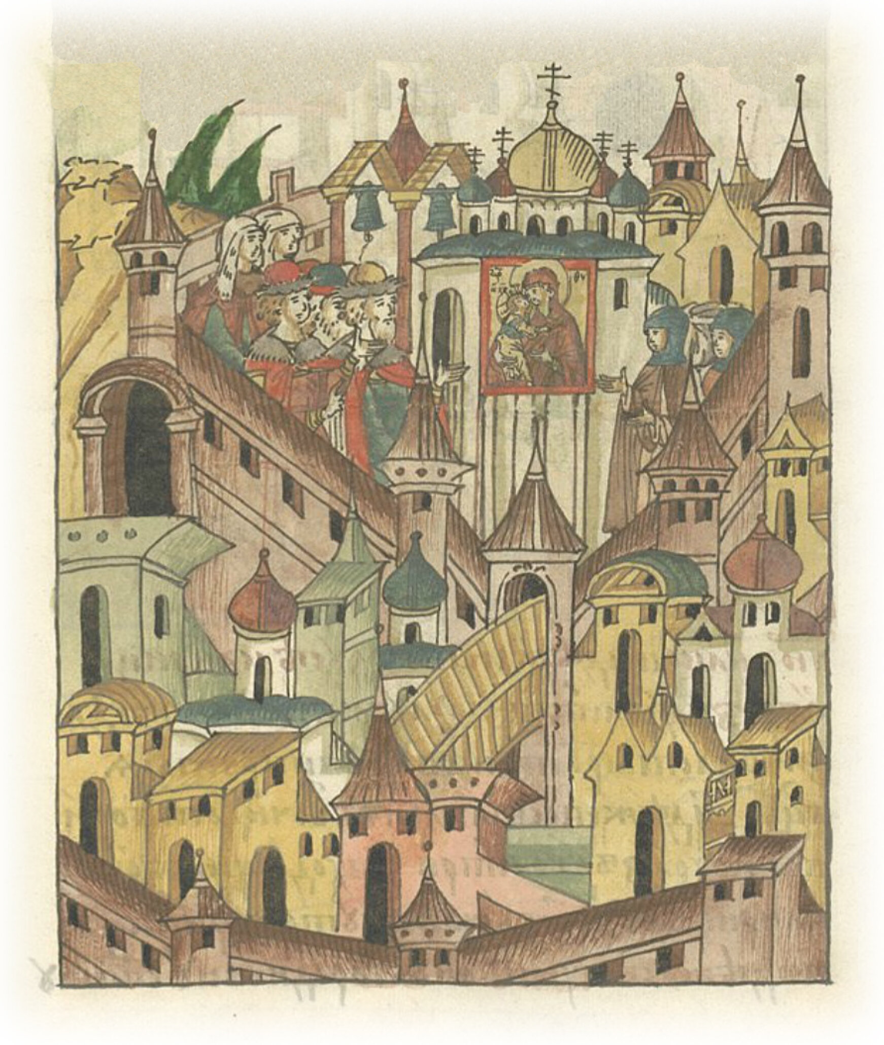 Так и этот приносящий исцеления образ Владычицы Богородицы некогда из Палестины в Царствующий град прибыл, и из Царьграда в одном корабле с Пирогощею в нашу Русскую землю в город Киев принесен был купцом благочестивому великому князю Георгию Владимировичу Долгорукому Мономаховичу, внуку Всеволода, правнуку Ярославову, праправнуку равноапостольного Владимира, просветившего всю землю Русскую святым крещением.